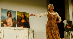 Sono 13 anni che il personaggio, ricostruito da Patrizia La Fonte, anche nella sua lingua, della fantesca di Leonardo, Maturina, il nome restituitoci dal testamento stesso del pittore scienziato, calca le scene d’Italia e di Europa. Per tre giorni, dal 13 al 15 marzo, ora torna al Teatro di Documenti di Roma. Si entra in una piccola sala tutta bianca, i mobili coperti da panni, la tela del San Giovannino in bella vista su una cassapanca, e appena il pubblico si siede, irrompe frettolosa la fantesca, rivolgendosi ad esso con le parole sopra citate.