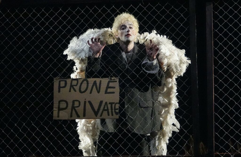 Davide Iodice tesse una tela fiabesca con ritmi da capogiro. I quadri illuminati da drammatici chiaroscuri (il design luci è di Loic Hamelin) si succedono uno all’altro scanditi da frizzanti colpi di scena. Dalla chiusura dell’Angelo in prigione alla liberazione grazie a un contadino; l’incendio nella casa del parroco e l’Angelo che si spinge dentro per salvare una giovane donna, la sola tra i pochi ad aver mostrato attenzione e solidarietà nei suoi confronti.