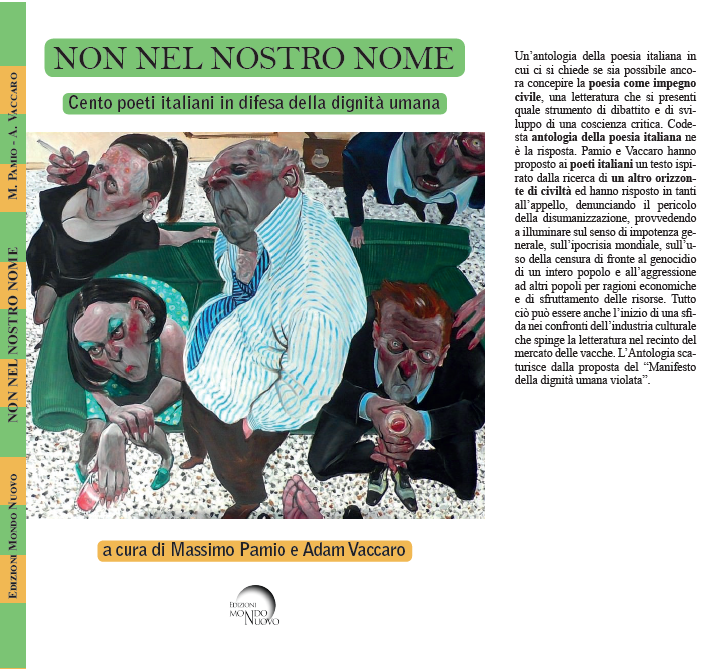 Da parte di 124 poeti, il tentativo di rivolgersi agli uomini di buona volontà, in un’antologoia “Non nel nostro nome. Cento poeti in difesa della dignità umana” (a cura di Massimo Pamio e di Adam Vaccaro, Edizioni Mondo Nuovo), un libro che, come scrive Nadia Cavalera, “non è un’antologia a tema:è un atto. È la decisione di non lasciare che la lingua pubblica — quella dei comunicati, delle giustificazioni, dei distinguo, dei “forse” — continui a passare come innocente. Qui la poesia si mette in mezzo, non per decorare la storia, ma per contraddirla, per incrinare la sua superficie liscia. E lo fa nel punto più scoperto: la dignità. Di che parla, dunque? Parla della disumanizzazione come tecnica moderna. Non solo delle bombe, ma dei dispositivi che rendono le bombe accettabili: l’abitudine, la neutralità, l’assuefazione, la parola addomesticata. La poesia, qui, registra che si uccide anche senza sparare. Qui la poesia arriva a una consapevolezza che sento mia e che, non a caso, ho formulato anche altrove: non si uccide solo col fuoco, ma togliendo il nome a chi soffre. È una verità che attraversa molti testi di questa raccolta: la violenza non è soltanto l’ordigno, ma il modo in cui viene raccontata, attenuata, normalizzata. Quando “difesa” significa sterminio, quando la parola diventa anestetico, siamo già dentro una grammatica criminale”.