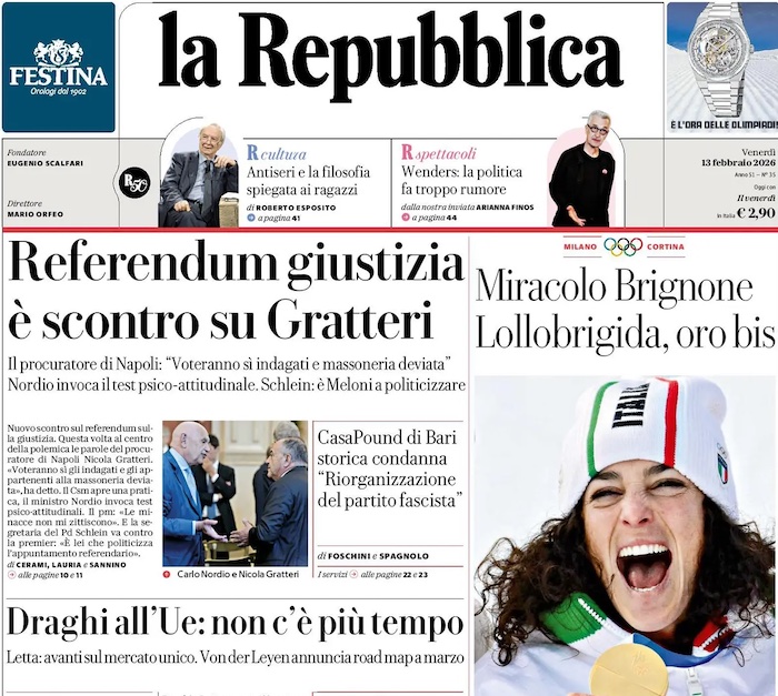 Olimpiadi Milano-Cortina, Federica Brignone trionfa nel super G e vince la medaglia d’oro 315 giorni dopo l’infortunio. Sfrutta le condizioni ideali nuvole basse e scarsa visibilità. I complimenti delle sue rivali e non solo. Il presidente Mattarella “Le medaglie sono degli atleti”. Su Brignone: “Bravissima, posso dire che ci contavo?” Medaglia d’oro anche per Francesca Lollobrigida che completa il successo avviato con la medaglia di sei giorni fa.