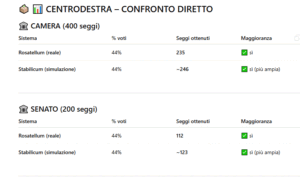 Nella prima simulazione usiamo ChatGPT di Open AI. Se si votasse con il Rosatellum, la coalizione di destra otterrebbe circa 235 seggi alla Camera e con lo Stabilicum (ovvero col proporzionale e con il premio di maggioranza) 246 seggi, guadagnando circa 10 seggi rispetto al Rosatellum, mentre al Senato passerebbe da 112 seggi a 123 seggi, guadagnando anche in questo caso solo 10 seggi.