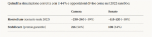 Per concludere, l’aumento del numero dei seggi che la destra otterrebbe se venisse adottato lo Stabilicum, nel caso in cui i risultati elettorali fossero identici a quelli del 2022 e gli altri partiti non si coalizzassero, non sarebbe tale da giustificare la serie di rischi che la destra potrebbe correre se venisse approvata la nuova legge elettorale.