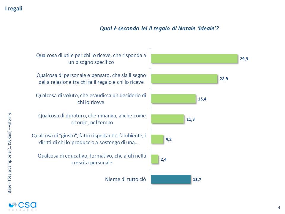 Che il regalo ideale sia qualcosa di utile o quello che risponde meglio alla personalità del destinatario, più della metà degli italiani lo traduce in atti di acquisto con attenzione al territorio, al commercio equo e solidale e alla sostenibilità. Anche il canale d’acquisto riflette questa intenzione con un riscatto del commercio al dettaglio e del punto di vendita fisico rispetto all’online, a cui comunque dichiara di rivolgersi il 30 % del campione.