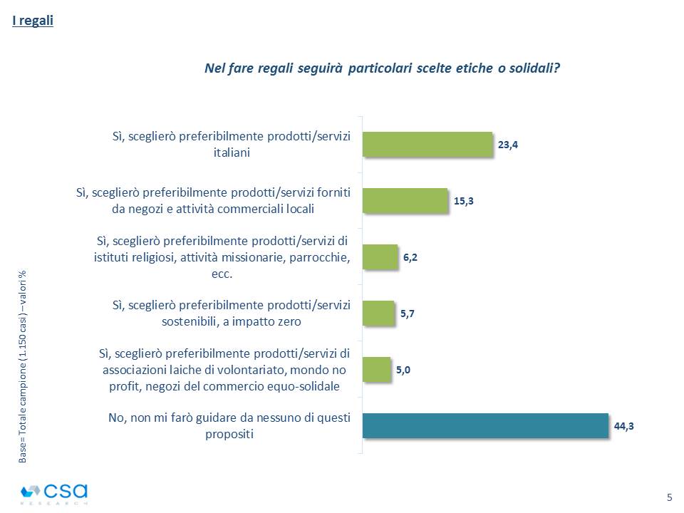 Sono i consumi a rivelarsi il campo privilegiato in cui riflettere questo spirito del Natale, con la metà degli atti d’acquisto, secondo il dichiarato degli intervistati, rivolto a un’offerta con un’etichetta, in qualche modo, etica. Un dato mai riscontrato in passato che riflette un cambiamento profondo di paradigma, un bisogno di avviare nuove dinamiche virtuose per una visione globale diversa di un mondo traballlante.