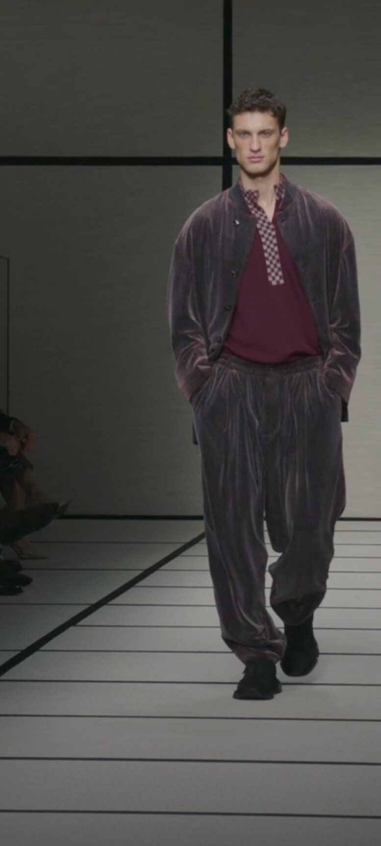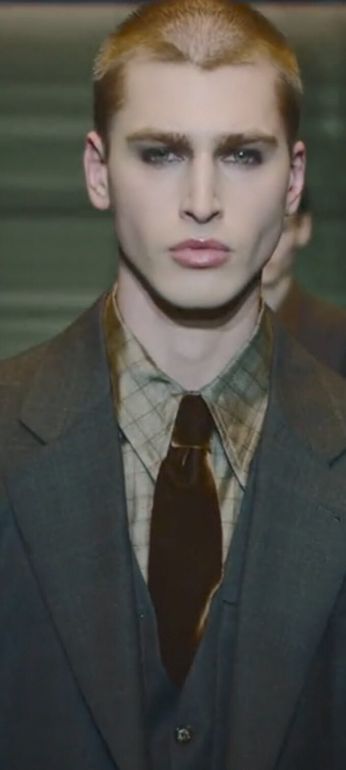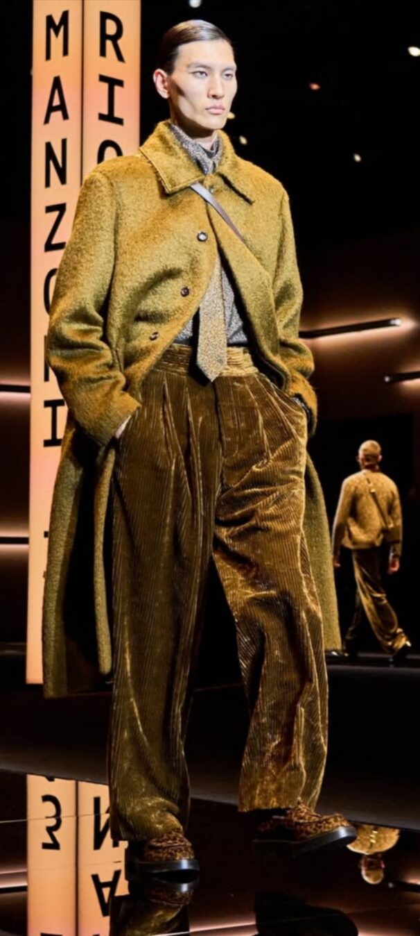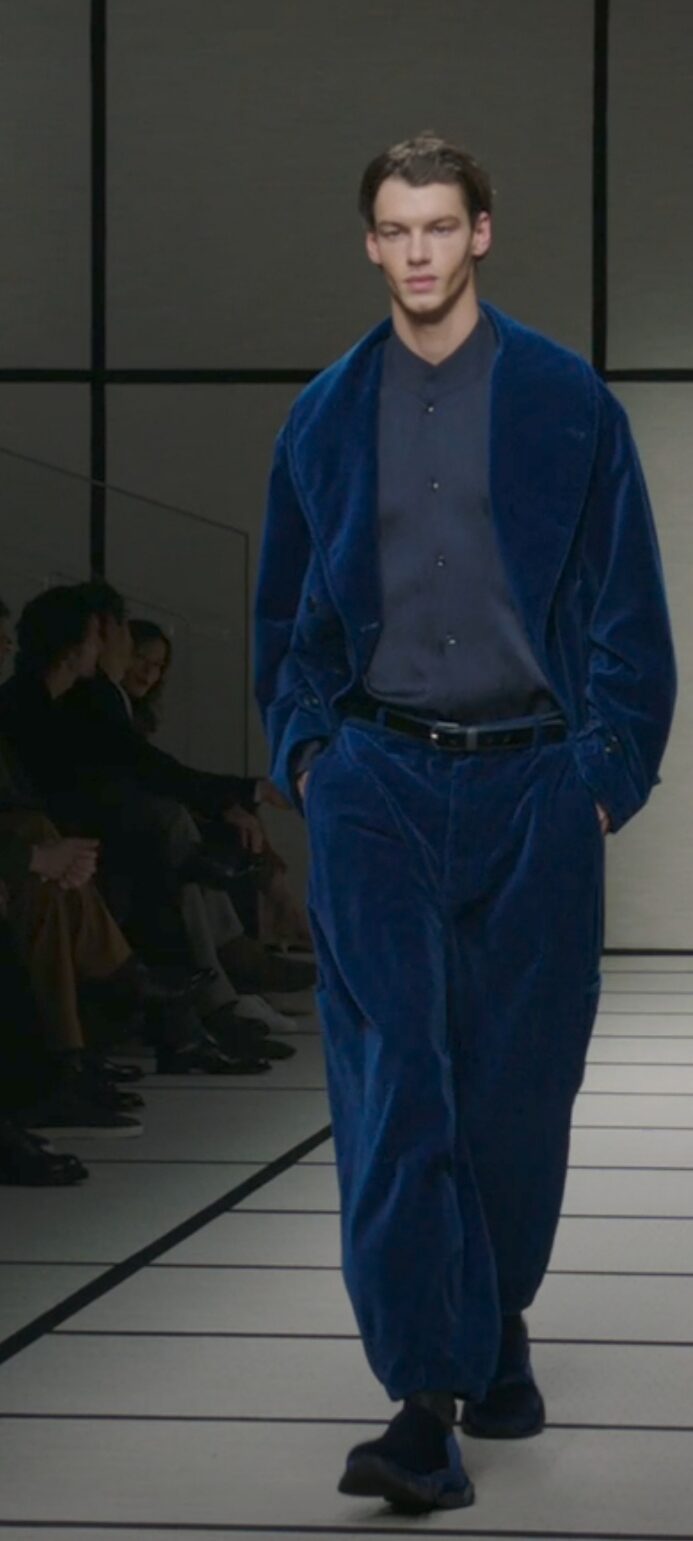 Giorgio Armani spiega ancora una volta al mondo cosa sia l’eleganza e quale legame inscindibile abbia con la gentilezza. Il suo Uomo sale in passerella con cappotti lunghi ed estremamente avvolgenti, pantaloni extra morbidi con pences, e tanta tanta maglieria, piena di sperimentazioni e texture varie. Tutto è prezioso, dai velluti al cashmere come pure le sete, nei colori verde, blu, rosso intenso e bordeaux lucente. Tutto è versatile e decisamente portabile, ma all’insegna della libertà che non accetta costrizioni di sorta. Le giacche, così come pure le camicie regalano il confort ideale, come anche i gilet zippati, o i cappotti che sulla schiena recano una fantasia gessata da indossare con magnifici tuxedo, donando un tocco informale ma sempre al top dell’eleganza. Non manca una emozionante parentesi dedicata alla collezione Armani Neve che richiama le prossime Olimpiadi di Milano-Cortina 2026. Al termine dello show, la standing ovation tra il pubblico in sala, risuona fragorosa per un Uomo che conquista da oltre 5o anni con il suo genio creativo senza pari.