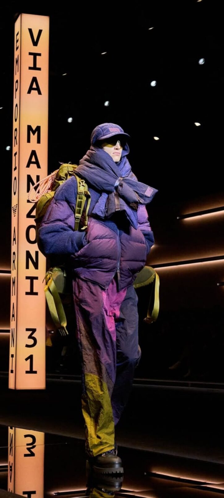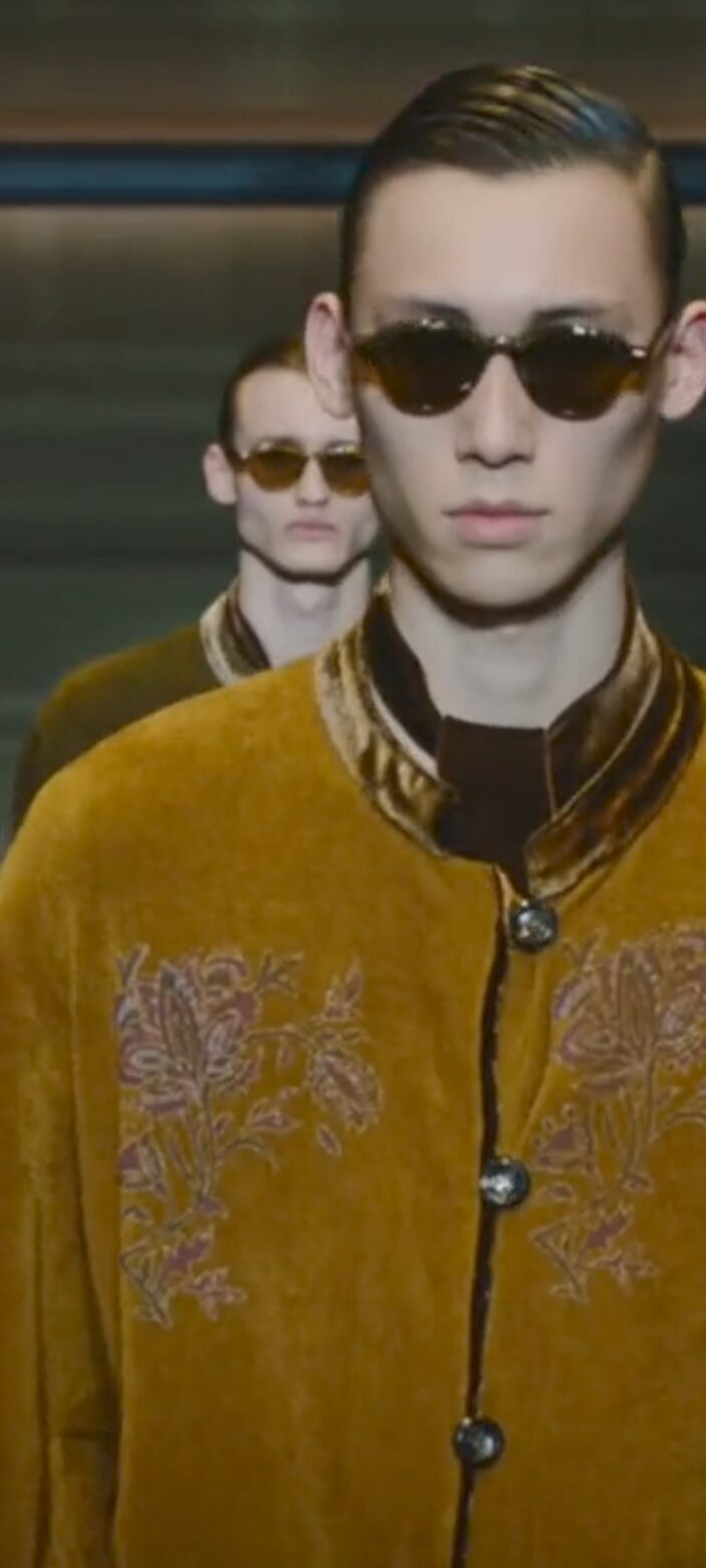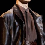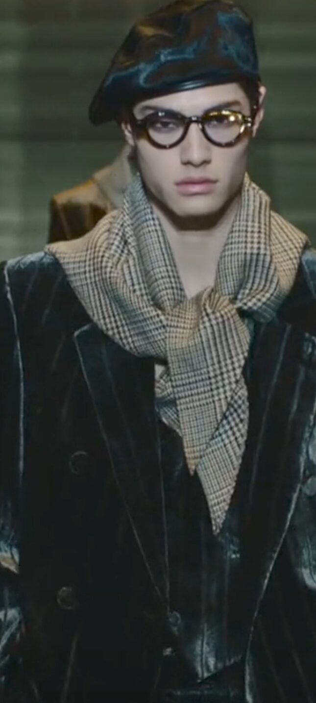 Al centro della passerella del Teatro Armani, si erge imponente una insegna luminosa girevole che richiama lo store di Emporio Armani in via Manzoni 31 a Milano, rimodernato e riaperto a settembre 2024. Comincia lo spettacolo, e si vedono i primi modelli muoversi con in sottofondo una tormenta di neve, indossando volumi over e colori sgargianti come il verde acido ed il viola, su velluti da spedizione in montagna. “Sedurre è l’abilità di condurre a sé, di avvicinare. Seducente è chi pratica quest’arte sottile, fatta di parole, atteggiamenti e modi di vestire”, spiega la maison. “Seducente” è il titolo che Giorgio Armani dedica all’intera collezione, giocando magistralmente sull’utilizzo di velluti morbidissimi, filati iridescenti e maculati, broccati, inneggiando al fascino ipnotico ed irrinunciabile della cultura che passa anche dal bel vestire…Echi di uno stile dandy, si fanno largo senza ostentare cliché, testimoniando parentesi felici di una estetica raffinata ed immortale. La perfezione sartoriale diviene protagonista indiscussa, per i completi composti da tre pezzi, su velluti scivolati e luminosi, per una scala cromatica che corre veloce dal color tabacco al marrone intenso, al cognac. Il verde oliva e i ricami di fiori preziosi, ammaliano, così come pure gli orologi da taschino che penzolano sul panciotto, cravatte annodate senza alcuna sbavatura. I pullover in maglia sopra t-shirt sobrie. L’ampiezza felice dei pantaloni con pences e guanti impalpabili a riscaldare le mani. Giorgio Armani, nella sua prima sfilata della Milano Fashion Week (la presentazione della collezione Emporio, precede sempre quella di Giorgio) inizia a raccogliere l’amore del suo pubblico che lo saluta a fine spettacolo, con applausi scroscianti ricambiati da un sorriso pieno.