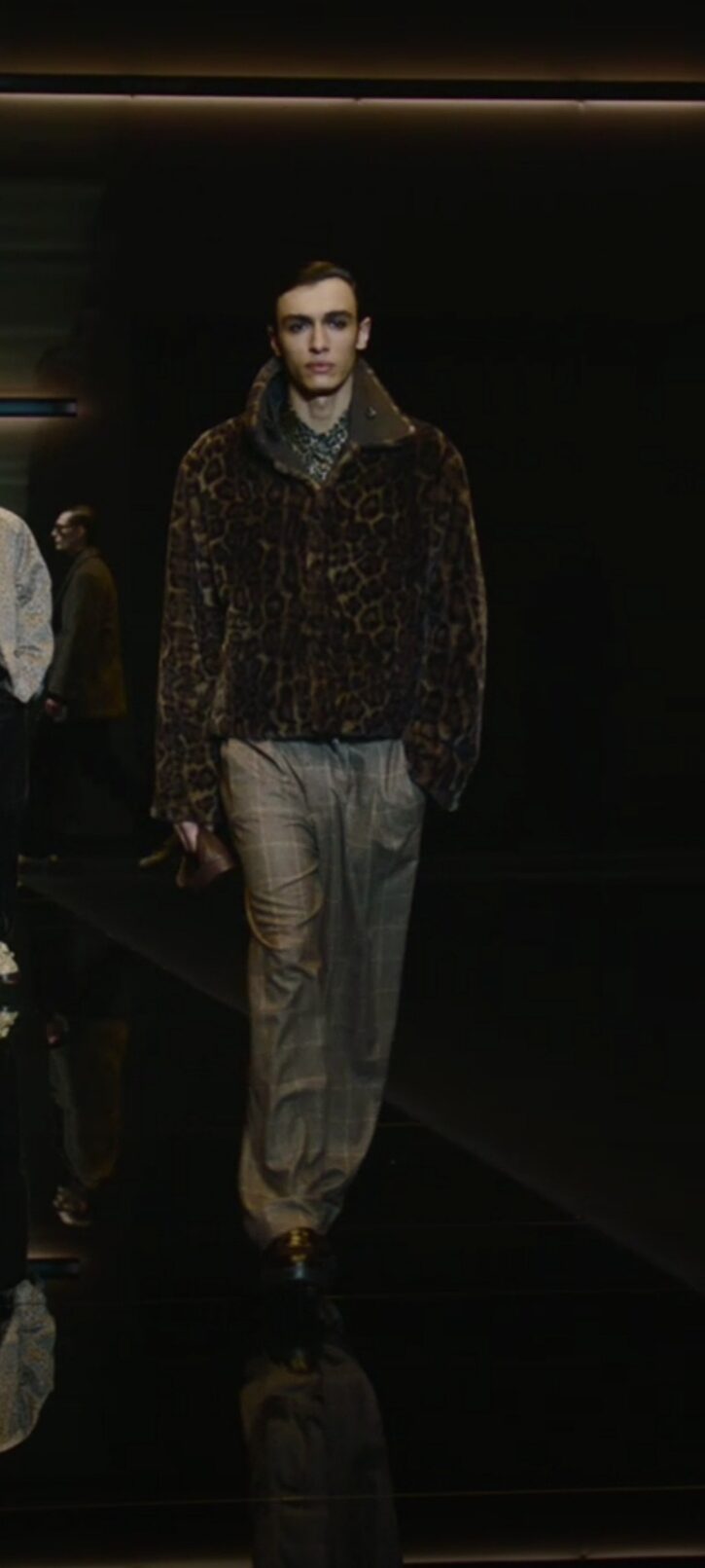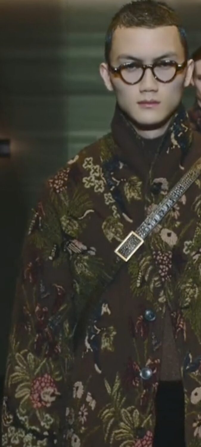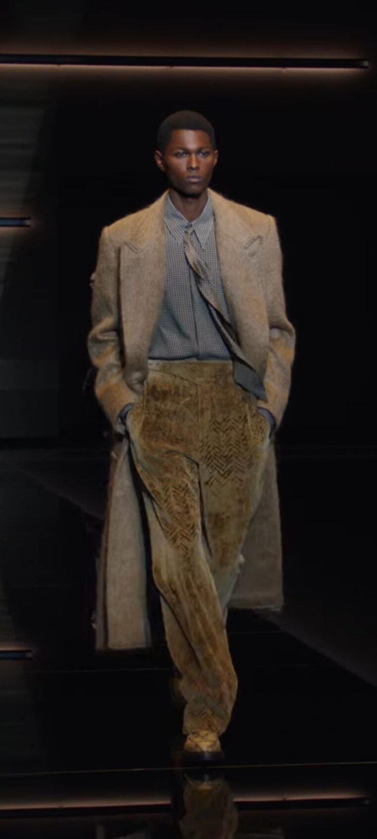 Al centro della passerella del Teatro Armani, si erge imponente una insegna luminosa girevole che richiama lo store di Emporio Armani in via Manzoni 31 a Milano, rimodernato e riaperto a settembre 2024. Comincia lo spettacolo, e si vedono i primi modelli muoversi con in sottofondo una tormenta di neve, indossando volumi over e colori sgargianti come il verde acido ed il viola, su velluti da spedizione in montagna. “Sedurre è l’abilità di condurre a sé, di avvicinare. Seducente è chi pratica quest’arte sottile, fatta di parole, atteggiamenti e modi di vestire”, spiega la maison. “Seducente” è il titolo che Giorgio Armani dedica all’intera collezione, giocando magistralmente sull’utilizzo di velluti morbidissimi, filati iridescenti e maculati, broccati, inneggiando al fascino ipnotico ed irrinunciabile della cultura che passa anche dal bel vestire…Echi di uno stile dandy, si fanno largo senza ostentare cliché, testimoniando parentesi felici di una estetica raffinata ed immortale. La perfezione sartoriale diviene protagonista indiscussa, per i completi composti da tre pezzi, su velluti scivolati e luminosi, per una scala cromatica che corre veloce dal color tabacco al marrone intenso, al cognac. Il verde oliva e i ricami di fiori preziosi, ammaliano, così come pure gli orologi da taschino che penzolano sul panciotto, cravatte annodate senza alcuna sbavatura. I pullover in maglia sopra t-shirt sobrie. L’ampiezza felice dei pantaloni con pences e guanti impalpabili a riscaldare le mani. Giorgio Armani, nella sua prima sfilata della Milano Fashion Week (la presentazione della collezione Emporio, precede sempre quella di Giorgio) inizia a raccogliere l’amore del suo pubblico che lo saluta a fine spettacolo, con applausi scroscianti ricambiati da un sorriso pieno.