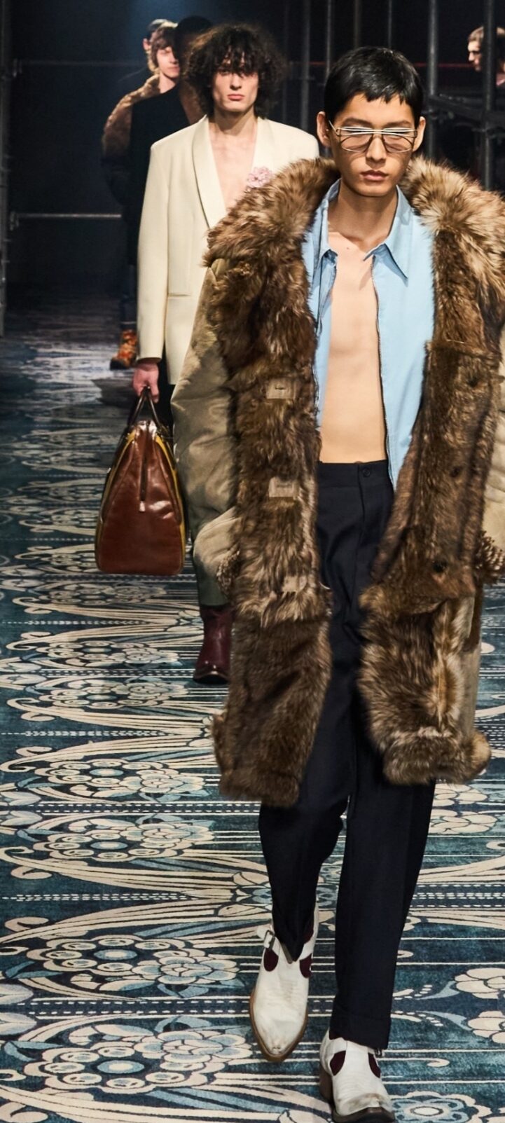 Miuccia Prada e Raf Simons, portano in passerella la collezione dal titolo Unbroken Instincts “Nell’istintivo possono rivelarsi una nuova raffinatezza e un’eleganza intima, selvaggia. I contrasti involontari danno vita a combinazioni inaspettate e seducenti, il corpo si veste libero dai vincoli della ragione”, commentano i due stilisti. Un istinto capace di superare la ragione, di appagare e permettere di seguire la propria indole. Giacche dal motivo check, doppi piumini con ancore, quadrifogli, su texani, e colori come l’azzurro o stampe floreali. Tessuti come la seta, la pelle lucida, la lana e il cotone che si alternano e incastrano in modo perfetto.