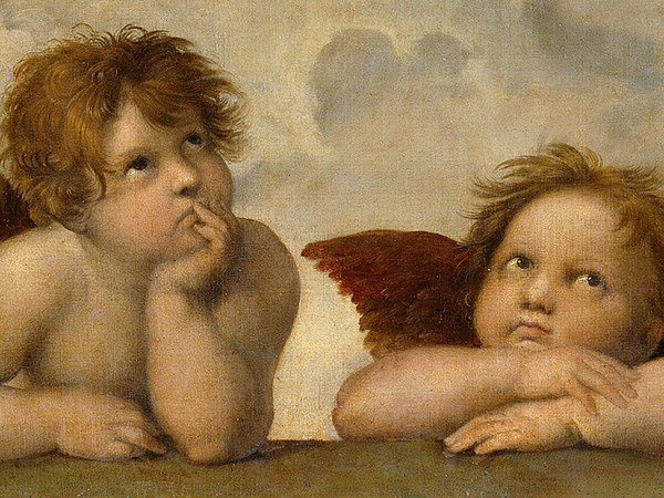 Approfitto per illustrarvi i miei angeli preferiti, posti alla base della Madonna Sistina di Raffaello (1513-1514). Sono semplicemente favolosi! Uniscono il divino al mondo terreno, simboleggiando purezza e trascendenza, ma con un tocco di umana contemplazione e irriverenza. Appoggiati alla balaustra, osservano la scena con aria trasognata e distratta, quasi annoiata, come se fossero sfuggiti al coro celeste, introducendo nella visione sacra un elemento di familiarità, tant’è che rimandano all’espressione da premio Oscar assunta dalla bambina nello spot della Rinazina. (Spero l’abbiate presente). Raffaello, qui, nel tentativo di dimostrare il suo interesse per la fusione tra spiritualità e forma umana, è davvero incredibile! Dipinge due angeli non in atteggiamento di adorazione solenne, ma di ozio meditativo: un dettaglio unico! Naturalmente, me ne guardo bene dal proporre paragoni con il capolavoro contemporaneo di San Lorenzo in Lucina, che resta un’opera fuori categoria, dequalificante per una struttura religiosa di tale portata e svantaggiosa per l’equilibrio e il valore che ogni Chiesa ha il dovere di raggiungere nell’allestimento del suo corredo artistico. Per il resto se ne può anche ridere.