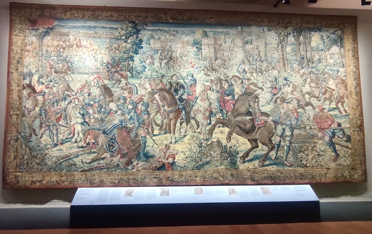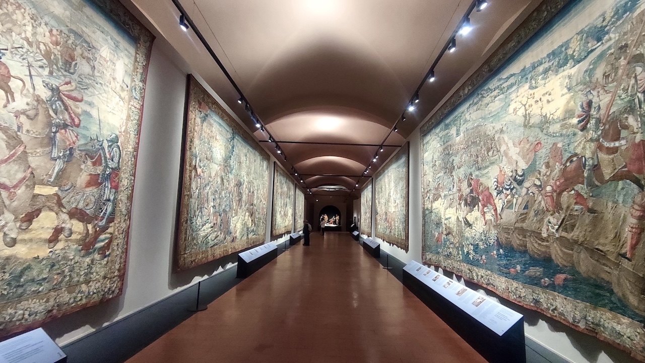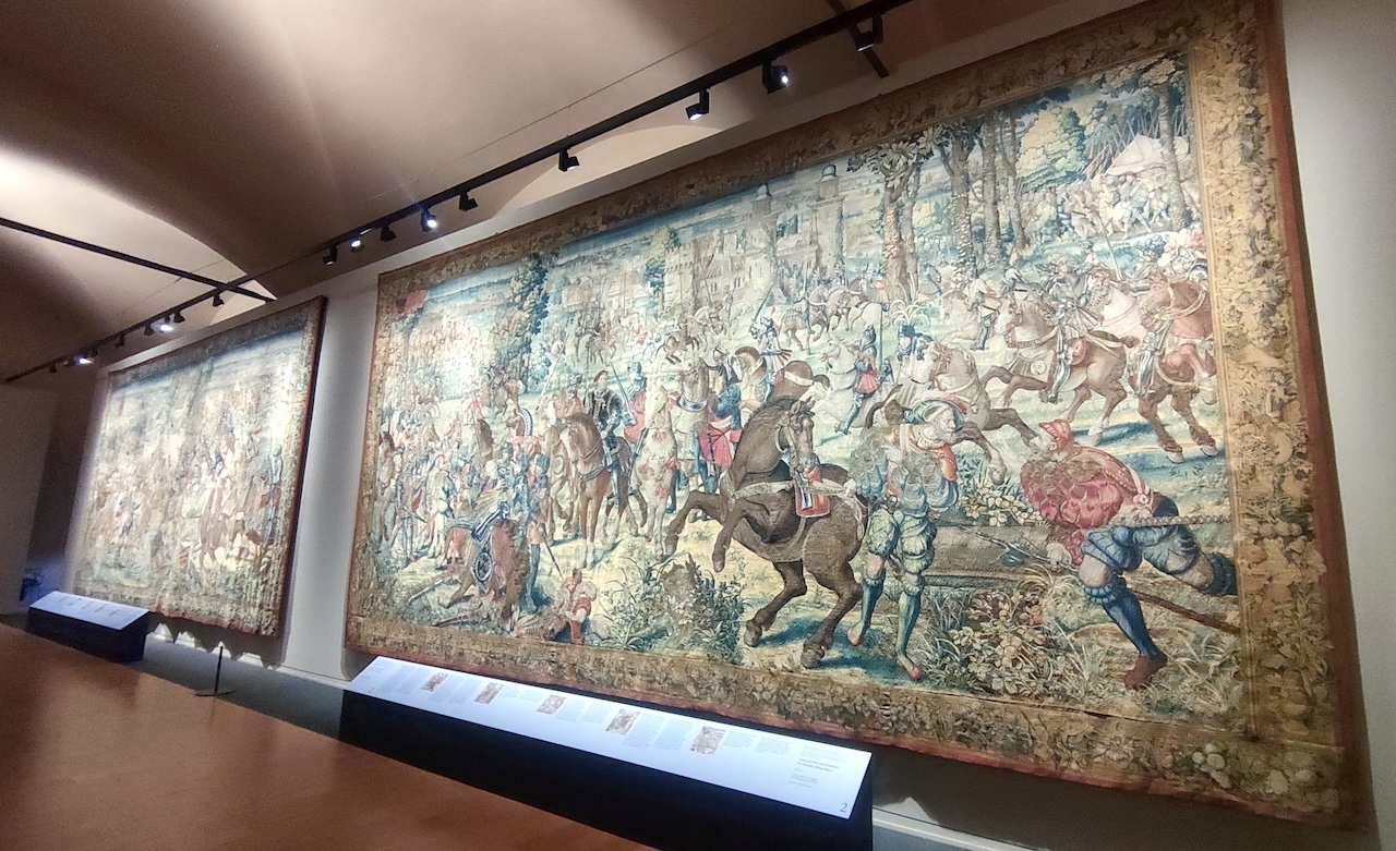 Oggi sono finalmente visibili, in coda alla mostra (fruibile sino all’11 gennaio 2026), i famosissimi sette arazzi tessuti a testimonianza di quell’evento bellico che cambiò, irreversibilmente, il corso della storia europea nel febbraio del 1525