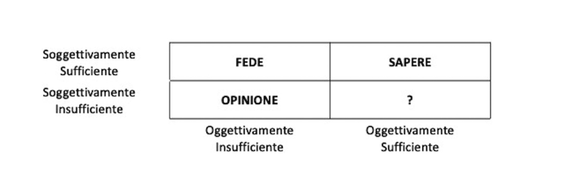 La distinzione kantiana tra opinione, fede e sapere, articolata lungo gli assi della sufficienza soggettiva e della sufficienza oggettiva, costituisce uno degli strumenti concettuali più efficaci per comprendere lo statuto del giudizio. Essa non classifica i contenuti delle affermazioni, ma il modo in cui il soggetto vi aderisce e il tipo di fondazione su cui tale adesione si regge. Il sapere è sufficiente sotto entrambi i profili; la fede è soggettivamente sufficiente ma oggettivamente insufficiente; l’opinione è insufficiente su entrambi i piani, e proprio per questo resta una forma di giudizio rivedibile, consapevole del proprio limite. Fornisce inoltre il terreno fertile sulla base del quale far crescere il sapere: senza il dibattito sulle opinioni non si verificano i presupposti per la crescita della conoscenza. In questo senso, l’opinione non è un residuo imperfetto del sapere, ma una sua condizione di possibilità dinamica. Questa tripartizione definisce lo spazio teorico del giudicare, ma non esaurisce le configurazioni logicamente possibili dell’assenso. La struttura concettuale kantiana, pur nella sua potenza, lascia aperta una possibilità che rimane implicita e non tematizzata.