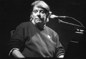 Un’immagine diel cantautore Fabrizio De André sul palco durante uno degli ultimi concerti in pubblico (Fotografia di Mario Rosas)