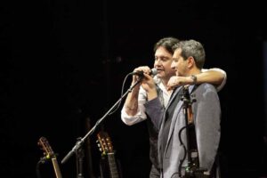 Cristiano De André in una pausa del concerto “De André canta De André” di Udine introduce Alfredo Franchini, l’autore dello studio sull’opera del padre e di Pier Paolo Pasolini