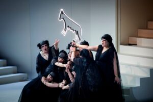 Questa lunga premessa era necessaria per intendere il lavoro interpretativo di Harding. Amplifico e completo qui quanto ho scritto nella recensione per il Manifesto. La Valchiria è un’opera insieme incandescente e dolcissima. Daniel Harding ha fatto venire fuori sia l’incandescenza che la tenerezza di una partitura che è tra le più veementi, ma anche tra le più intime di Wagner. C’è un’orchestra sterminata, è vero, ma è banale diceria che sia fragorosa, magniloquente. Non è vero. L’orchestra amplissima serve al compositore per avere a disposizione un’infinita sfumatura di timbri – gli assolo del violoncello, del corno inglese, del clarinetto – la scrittura è il più delle volte cameristica, ristretta a piccoli gruppi strumentali, e pertanto sempre contrappuntistica. Lo si è sentito fin dall’attacco, il basso ostinato e la figurazione tempestosa che cresce a poco a poco e il motivo che prende forma. Ma c’è di più. Non solo l’accordo dell’orchestra con le voci è perfetto, ma è come se le voci siano insieme recitazione e parte dell’orchestra, siano cioè la parte umana, vocale, dell’intero edificio musicale. Harding mette in rilievo i momenti di pura recitazione e in quei momenti l’orchestra sostiene delicatamente le voci, ma poi ci sono i brani di ampio respiro melodico, di espansione lirica e qui la fusione tra voce e orchestra è mirabile. Tra i personaggi spicca, sublime, la Sieglinde di Vida Miknevičiūté. Incredibile la varietà dei toni espressivi, dalla delicatezza alla disperazione, al furore. Un personaggio complesso, dalle molte sfaccettature, l’analisi psicologica è sorprendentemente moderna, Sigliende s’interroga sulle radici infantili di certe paure. e lì la voce di Miknevičiūté si ammorbidisce fino alla pacata intimità di un Lied. Ma la Brunilde di Miina-Liisa Värelä non è meno varia, passando dalla solennità della guerriera alla dolcezza smarrita della figlia. Il Wotan di Michael Volle incarna bene il dio impetuoso e furente, ma anche tormentato, infelice, dilaniato tra uno spasmodico slancio di potenza e lo sconforto del fallimento, capace infine anche lui di un dolore non altrimenti esprimibile che con una voce che manca o addirittura senza voce, in silenzio, con il gesto della mano che asciuga la lacrima sull’occhio, la pietà per il figlio ingiustamente e inutilmente ucciso, lo scoramento per la necessità di punire una figlia amatissima. Lo Hunding di Stephen Milling, spavaldo e arrogante, rende con efficacia il contrasto tra i problematici eroi figli di un dio e la rozza certezza del “bestione” vichiano che conosce solo la legge del sopruso. La Fricka di Okka von de Damerau, ferita nella sua dignità di custode del Diritto, ma soprattutto, sembra, per il tono talvolta aspro talaltra insinuante della voce, addolorata di dovere contrastare il marito, come se tanta rabbia per l’oltraggio, fosse anche lo sconforto per i suoi tradimenti e dunque quell’ira per il rispetto della legge lui gliela strappasse a forza. Un lato, questo, del personaggio che non sempre viene messo in luce: quasi che la rivalsa contro Wotan fosse anch’essa la protesta per un’ingiustizia imposta dal dio. Tutti s’inseriscono quindi in una omogeneità musicale che mira a un perfetto accordo tra musica e dramma. Meno incisiva può darsi l’interpretazione di Jamez McCorkle nella parte di Siegmund, come se la voce non avesse la forza di reggere il volume sonoro dell’orchestra. Ma va anche detto che qui l’orchestra è appena sotto la scena, e in vista, e dunque il rapporto tra gli strumenti e le voci non ha barriere, filtri. A Bayreuth l’orchestra è sprofondata ben sotto il palcoscenico, e una sorta di tetto la copre togliendola alla vista del pubblico, ma anche filtrando e dirigendo il volume sonoro. Ma anche nei normali teatri del mondo non è collocata così vicina, a contatto quasi con i cantanti sulla scena. Bravissime tutte e otto le altre Valchirie: Sonja Herranen, Hedvig Haugerud, Claire Barnet-Jones, Claudia Huckle, Dorothea Herbert, Virginie Verrez, Anna Lapkovskaja, Štěpánka Pučálková. Tutti poi stupiscono e commuovono non solo per una musicalità straordinaria, ma anche per una intonazione impeccabile.