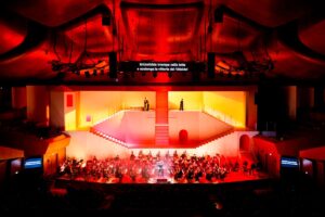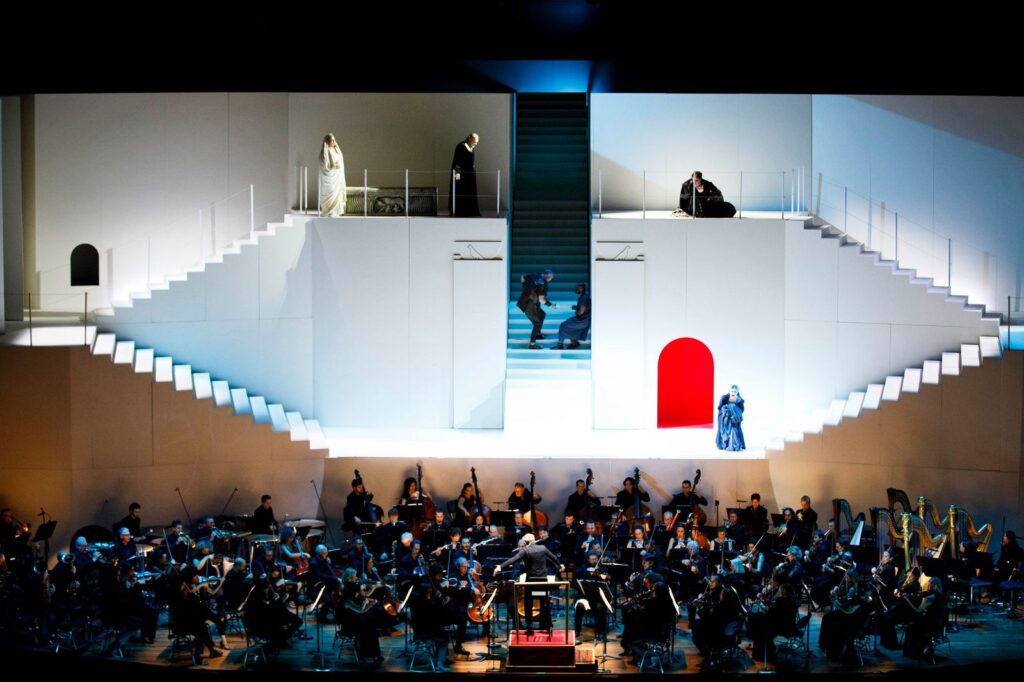 La novità di questa inaugurazione di stagione è la messa in scena. Di solito a Santa Cecilia le opere si danno in forma di concerto. Come, del resto, in quasi tutte le istituzioni concertistiche del mondo. La regia è stata affidata a chi è stato anche collaboratore di Chéreau, Vincent Huguet. Fin dall’ingresso in sala si vede una sorta di grande palazzo tra l’arcaico e il modernista geometrico, tutto bianco (scena di Pierre Yovanovitch. Quattro scalinate laterali e una centrale. Il regista e lo scenografo spiegano che hanno voluto ispirarsi alla città in cui si svolge lo spettacolo, Roma. Il palazzo può fare pensare a stampe di Piranesi, ma anche al quartiere dell’EUR. E a un certo punto, anzi, appare addirittura la lupa di Romolo e Remo. A Roma Wagner ha dedicato un’opera, Rienzi. E l’allusione al mondo classico fa parte di quasi tutta la sua opera, il suo orgoglio germanico non offusca l’ammirazione per l’antichità classica, ma se mai, da protestante vi si può intravedere diffidenza e perfino disprezzo (finale dei Maestri Cantori) per la Roma dei Papi. Del resto Cola di Rienzo fu un tribuno, e per Wagner un restauratore delle libertà repubblicane contro l’ingordigia della nobiltà papale. L’azione di questa Valchiria si svolge tutta in questi spazi. Le luci, di Christophe Forey, compresi i lampi, il rosso delle fiamme, si sono dovute adattare alla scarsità dei dispositivi disponibili, in una struttura, come quella della Sala Santa Cecilia dell’Auditorium Parco della Musica di Roma, costruita senza prevedere l’allestimento di spettacoli. Un monito forse, per aggiornare queste strutture, se si vuole continuare a rappresentarle, oltre che a eseguirle in forma di concerto, le opere di teatro musicale. Come si fa, per esempio, nel Megaron di Atene. Il pubblico si è reso conto di trovarsi ad ascoltare e vedere un’edizione della Valchiria memorabile, di riferimento, e ha accolto tutti gli interpreti con fragorosi ed entusiastici applausi.