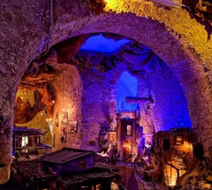Quando anche le statuine dei pastori erano ai loro posti, nel buio stanzone le luci colorate si accedevano e spegnevano e i ragazzi invitati allo spettacolo s’incantavano dietro le figure di pastori, macellai, pescivendoli, acquaioli, falegnami: un’immobile società in miniatura dispersa fra balzi, valloni, sentieri e anfratti.