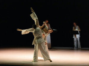Una modalità particolarmente apprezzata al Nord dove vive l’eredità di grandi maestri. Nel caso di Pisu ad esempio, sembra di leggersi a tratti l’influenza di un genio della danza contemporanea qual’è lo svedese Mats Ek, insignito nel 2016 del Premio Europa del Teatro a Craiova. Un maestro che ha raccolto l’insegnamento di Bausch e altri evolvendo verso uno stile fortemente connotato nella espressività corporea ma lontano da accademismi. E, giusto per decodificare altri possibili -e nobili- riferimenti, non si può non leggere nel preambolo dello spettacolo, o se vogliamo anteprima, prima parte dell’opera una influenza artistica di un cenacolo d’artisti particolarmente attivi tra i Sessanta e Settanta quale fu il gruppo Fluxus. Al suo interno figure di primo piano pure assai differenti: da Joseph Beuys a John Cage, da Dick Higgins a June Paik, da La Monte Young a Wolf Vostell. Artisti che hanno sperimentato in modo avanzato media e nuove forme di espressione artistica concettuale.