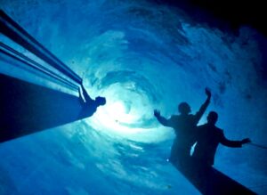 A mettere il sigillo en plein air del connubio tra musica, video e luce laser, tra i primi lavori della compagnia, nel 1984, è l’installazione-spettacolo “Intervallo” che rivisita il fiume Arno a Firenze, tra l’iconico Ponte Vecchio e il Ponte alle Grazie. Nascono una dietro l’altra opere intriganti che si nutrono della luce come sorgente di ispirazione. Nel 1985 a Marina di Pietrasanta è l’installazione “Elettriche Lune” , l’anno dopo “Metamorfosi”, evento d’apertura del festival Ars Electronica di Linz ambientato nella centrale Haptplatz,poi riadattato per Firenze Capitale della Cultura nella rinascimentale piazza Annunziata. Importante tassello nella storia di Krypton è anche “Fluidi” del luglio 1983, messo in scena a Mantova in collaborazione con la compagnia Ipadò, dove, come scrive Cauteruccio nelle sue note di regia “la luce coerente del laser costruisce attimi di architettura, segna percorsi possibili, traiettorie infinite, tracciando il limite di un linguaggio che sta tra la geometria e la poesia”.