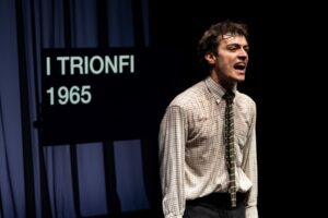 Per sempre. Testi tratti da lettere e cartoline inedite di Giovanni Testori ad I Trionfi di Giovanni Testori, dediche private di Giovanni Testori ad Alain Toubas. Ideazione, drammaturgia e creazione Alessandro Bandini. Con Alessandro Bandini. Dramaturg Ugo Fiore, sguardo esterno Alessandro Sciarroni, coaching Tindaro Granata, consulenza spazio scenico Giulia Pastore, disegno luci Elena Vastano, styling Ettore Lombardi, consulenza musicale Federica Furlani, tecnico luci, audio e video Alessandro Di Fraia. Produzione LAC Lugano Arte e Cultura, in coproduzione con Piccolo Teatro di Milano – Teatro d’Europa, CTB Centro Teatrale Bresciano, Emilia Romagna Teatro ERT / Teatro Nazionale, in collaborazione con Casa Testori, Institut Culturel Italien de Paris, La Corte Ospitale di Rubiera, con il sostegno di Inteatro Residenze, Fondazione Armunia. Foto di Masiar Pasquali