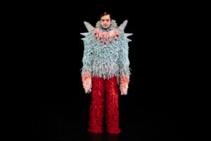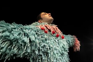 Cala il buio, la scena si accende su una figura accovacciata a terra, il corpo è ricoperto di un piumaggio colorato – ideato da Rebecca Ihle – che vibra dal rosso al celeste al rosa chiaro, come il manto di un animale esotico. Sul dorso speroni dall’aria inoffensiva completano una sagoma curiosa, appariscente.