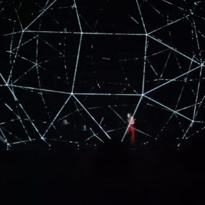 In questo modo la realtà sonora e quella visiva s’integrano e formano un’unica partitura, l’espansione dell’astratto disegno del poligono che alla fine prende quasi la forma di una sfera, da una parte, e l’emergere della voce del Narratore, alla quale succede l’andamento ritmico delle poesie dette dall’attrice per insinuarsi infine nel canto del soprano, che trasvola dalla cantilena popolare all’irta emissione di un canto che ricorda gli esperimenti delle avanguardie europee del secondo novecento, ma senza mai travalicare il confine di una percepibile continuità melodica, formano un’unica, gigantesca partitura insieme visiva e sonora come se la figura prendesse suono e il suono si facesse figura.