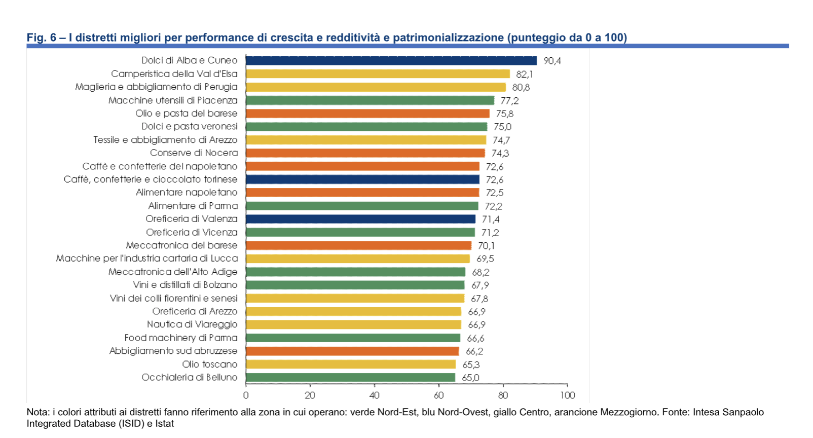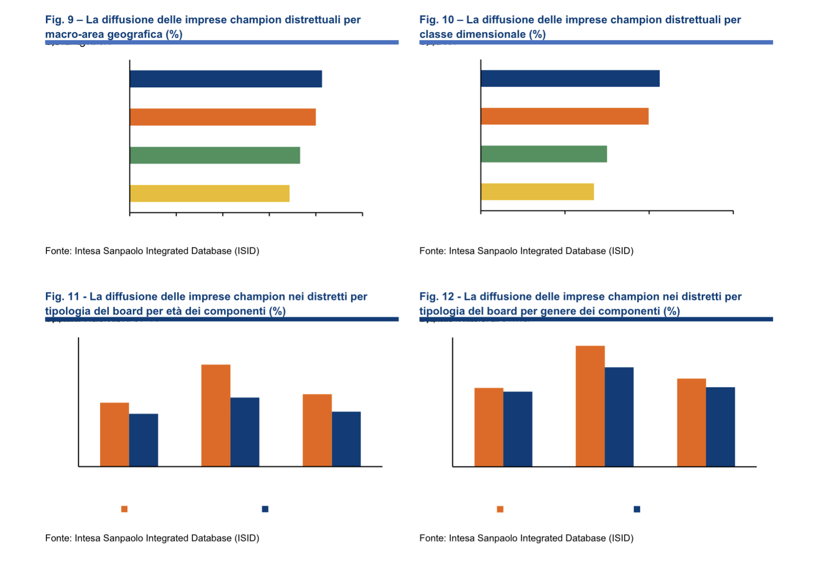 Un elemento chiave del tessuto distrettuale italiano è rappresentato dalle imprese champion: circa l’8% del totale, sono aziende più giovani, innovative e con una forte vocazione internazionale. Spicca la presenza di donne e giovani nei consigli di amministrazione, fattori che rafforzano competitività e capacità di adattamento.