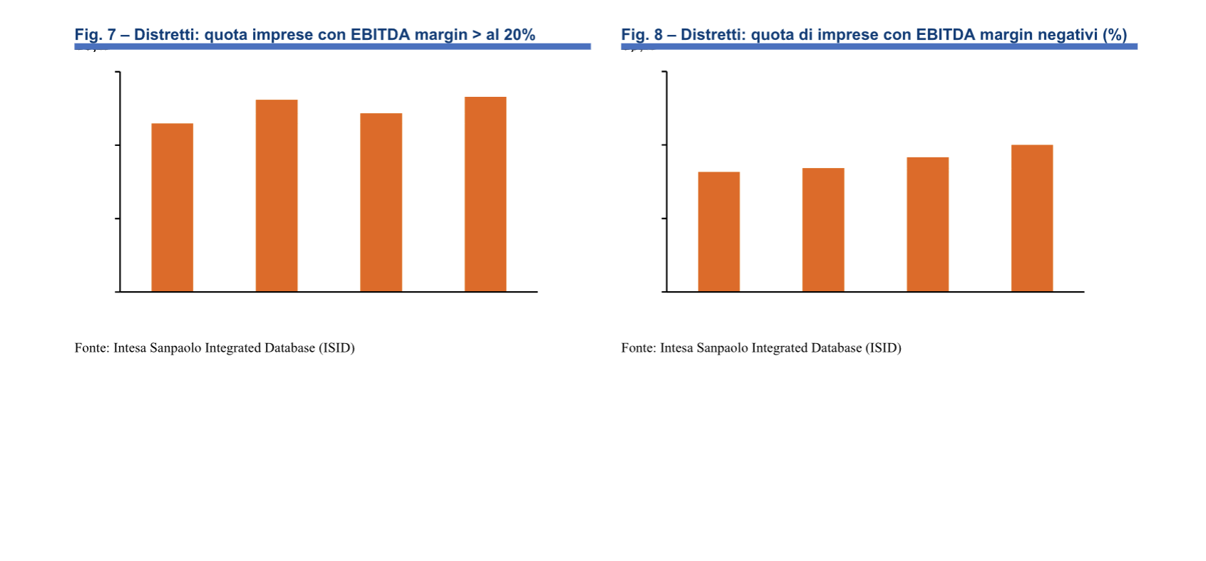 Il biennio 2023-2024 ha visto una stabilizzazione del fatturato dei distretti a quota 344 miliardi di euro (-0,5% rispetto all’anno precedente), dopo il boom post-pandemico. Nonostante un leggero rallentamento nella crescita, la redditività è migliorata: l’EBITDA margin è tornato sopra l’8% (8,1% rispetto al 7,6% del 2022), segno di una struttura aziendale più solida e resiliente.