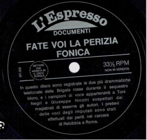 3) Le accuse sul rapimento e uccisione dell’onorevole Aldo Moro si basava su cinque intercettazioni telefoniche attribuite a Negri e una a me. Per tentare di capire se le voci fossero davvero nostre i magistrati ordinarono le perizie foniche di comparazione delle nostre voci – registrate appositamente nel carcere di Rebibbia – con quelle delle intercettazioni telefoniche. Così quando venni scarcerato il mio amico e collega de L’Espresso Mario Scialoja, al quale devo il mio ingresso nel giornalismo, ebbe l’idea di allegare a un numero del giornale un disco con le registrazioni delle voci sia dei brigatisti che nostre. Mario ebbe l’idea, io procurai il materiale chiedendolo al mio perito fonico di parte, il docente John Trumper, inglese trapiantato in Italia. Nacque così il disco “Vate voi la perizia fonica”, allegato a L’Espresso del 27 gennaio 1980[5] (oltre 300mila copie vendute). Nell’etichetta sotto il titolo c’era scritto: “In questo disco sono registrate le due più drammatiche telefonate delle Brigate rosse durante il sequestro Moro, e i campioni di voce appartenenti a Toni Negri e Giuseppe Nicotri sospettati dai magistrati di esserne gli autori. I prelievi delle voci degli imputati sono stati effettuati dai periti nel carcere di Rebibbia a Roma”