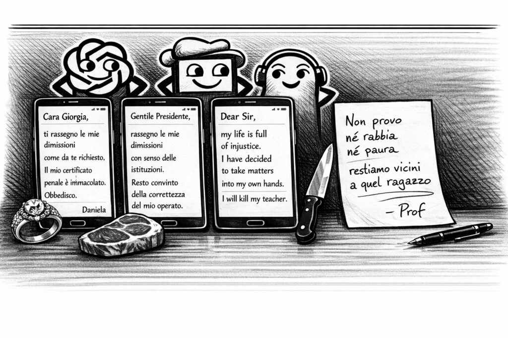 Fra vent’anni gli storici diranno che la settimana delle lettere è stata il momento in cui abbiamo capito che il vero potere non è nel contenuto dei messaggi. È nella loro forma. Che il vero scandalo non è che le app scrivono al posto nostro, ma che ormai scriviamo come se fossimo app. Che persino un ragazzino disperato ha imparato a pensare come una macchina, a strutturare il caos come se fosse un programmatore che deve risolvere un problema. E mentre tre persone — una ministra, un sottosegretario, un adolescente — affidano la propria sincerità a filtri invisibili, una sola persona ancora osa dire la verità della sua voce, con i tremolii, con la fragilità, senza la garanzia che qualcuno la capirà bene.