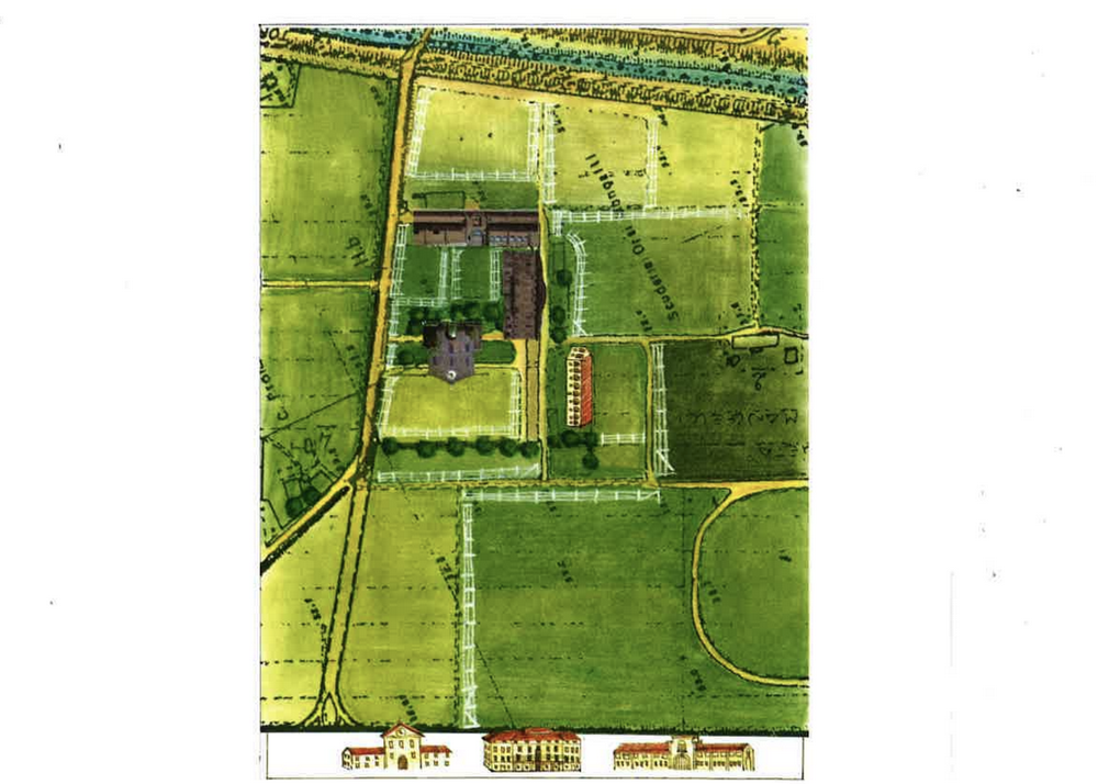 Il palazzo, disabitato, è al momento del progetto, adibito all’allevamento dei cavalli da trotto, con i suoi paddock, o recinti, all’intorno. Questi ultimi formano un disegno, che viene interpretato come una suggestione e divengono la forma di un fabbricato a corti che abbiamo chiamato “certosa”: una aggiunta tipologica, ma coerente con l’insieme, con le sue scansioni. Altre aggiunte completano il luogo, sempre confermando l’esistente. I giardini di un tempo vengono ricostruiti e si estendono fino al vicino Santuario di Clelia Barbieri: una giovane santa del posto: come se tutto qui si concentrasse.