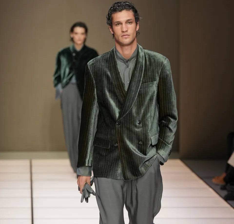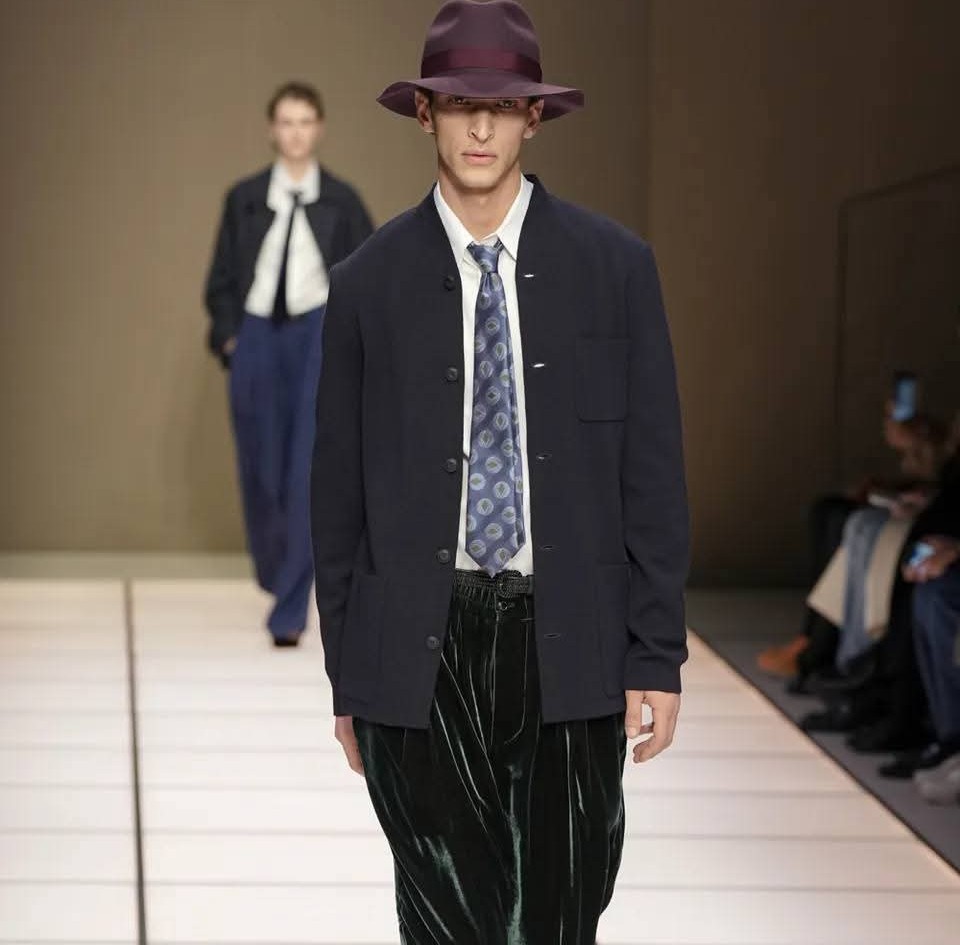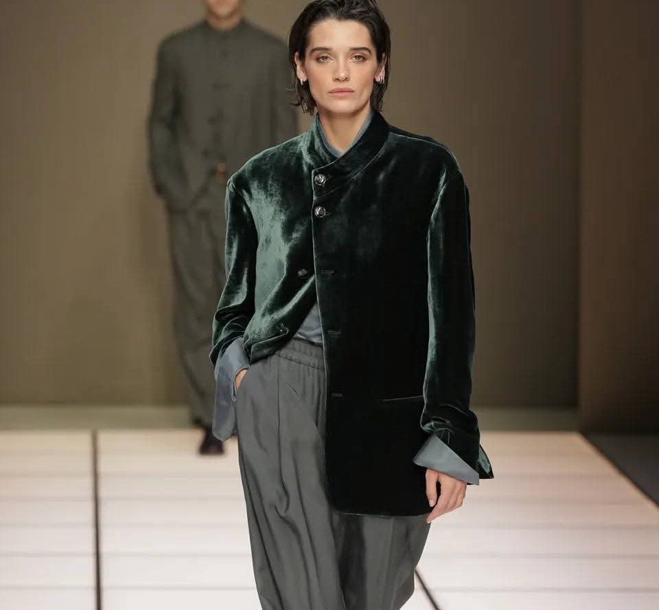 E poi c’è il gesto più inatteso: il colore. Questa sfilata per il prossimo autunno-inverno 2026/2027, dal titolo “Cangiante”, porta in passerella un verde squillante, un viola profondo, un azzurro luminoso. Toni che Giorgio Armani aveva solo sfiorato. Eppure, nelle mani di Dell’Orco, non suonano come una dissonanza, ma come una variazione necessaria. È il colore che rinnova senza tradire. Che entra in punta di piedi, come un soffio d’aria in una stanza perfettamente ordinata. Il risultato è una collezione che non ha bisogno di dichiarare la propria fedeltà: la incarna. Dalle giacche con collo alla coreana ai cappotti double-face, dai velluti panné, ai maglioni dal pelo lungo, tutto parla una lingua nota, ma pronunciata con una voce leggermente diversa, con delicatezza, quasi accarezzando il cambiamento, che non potrà mai rinnegare la storia su cui si regge.