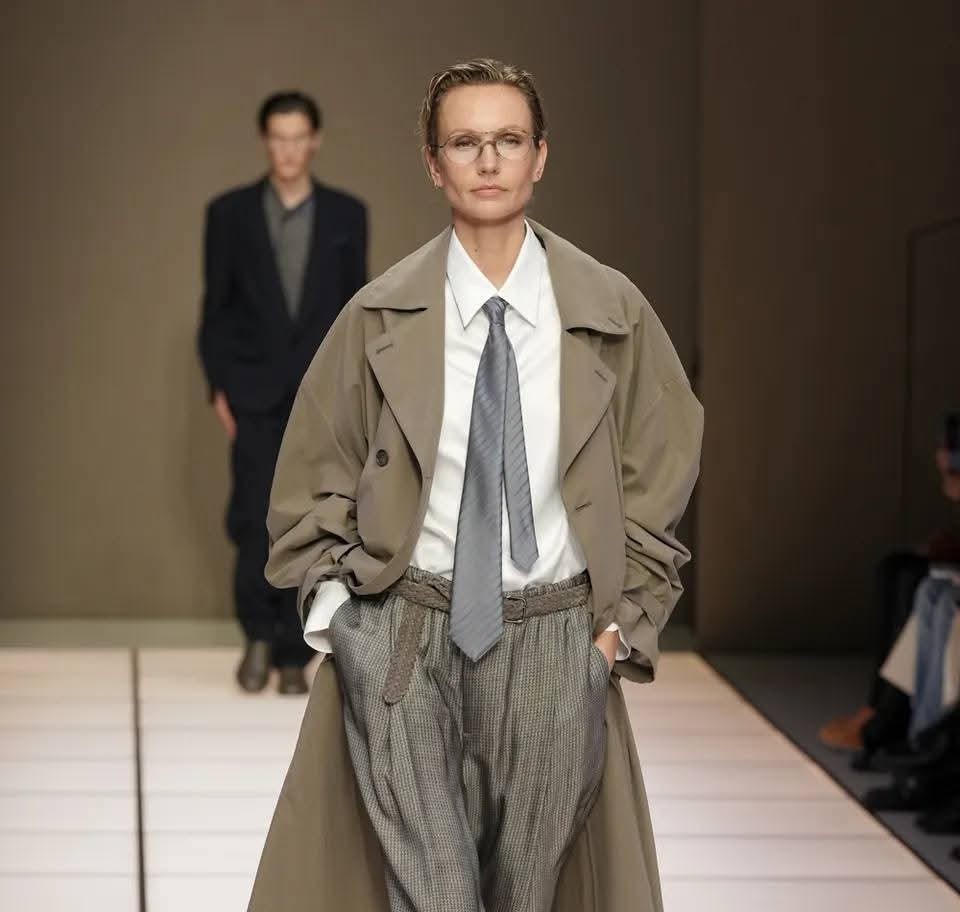 Un altro segnale forte è la presenza di numerosi look femminili, quasi speculari a quelli maschili. Non un esercizio di stile, ma una dichiarazione culturale: l’eleganza, per Armani, non è mai stata una questione di genere, bensì di atteggiamento.