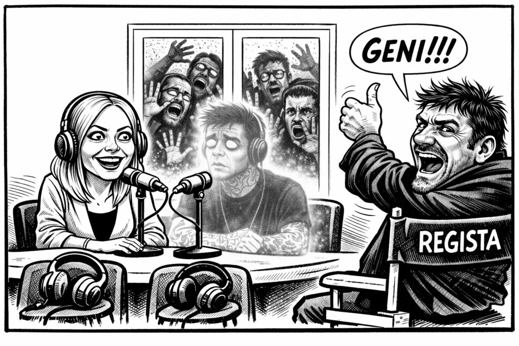 C’è però un dettaglio che Meloni non ha considerato—o forse lo sa benissimo e per questo la cosa diventa ancora più comica. In Italia ormai ci sono più podcast che ascoltatori di podcast. Non è una battuta. È il dato reale di un’inflazione mediatica che ha trasformato il podcast da strumento di comunicazione a nicchia esotica dove tutti parlano e nessuno ascolta. Migliaia di voci che gridano nel deserto digitale, ciascuno convinto di avere udienza mentre l’algoritmo distribuisce il silenzio con equanimità. La strategia trumpiana di Meloni arriva dunque al momento stesso in cui il podcast ha smesso di essere un luogo di comunicazione e ha cominciato a essere un luogo di masturbazione verbale. Il presidente del Consiglio scopre il medium nel momento esatto in cui il medium è già morto. Non è che non vincerà gli incerti. È che gli incerti, probabilmente, non ascolteranno neanche il podcast. L’eventuale aumento di ascoltatori sarà dovuto ai poveri colleghi giornalisti che per venerdì dovranno a scrivere un pezzo sull’argomento. Gli altri continueranno a scrollare Instagram—dove almeno le foto di Fedez con lo sguardo perso nel vuoto e Meloni sorridente potranno essere commentate, prevedibilmente, con una serie numericamente infinita di insulti. Il vero referendum che appassiona gli italiani.