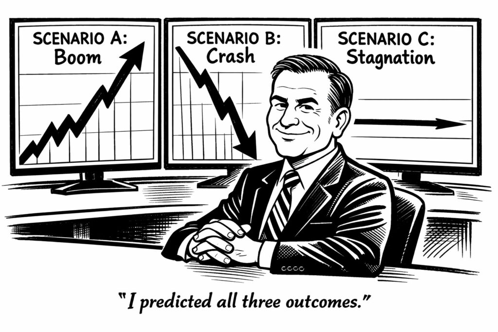 Osservando gli analisti nei momenti di crisi, noti questo fenomeno: non dicono “non so”. Dicono “ecco tre quadri ugualmente possibili, mettiamoci grafici e fogli di calcolo” e il messaggio è sempre: paga la consulenza, continueremo a parlarti di quello che non sappiamo con tono di chi sa molto.