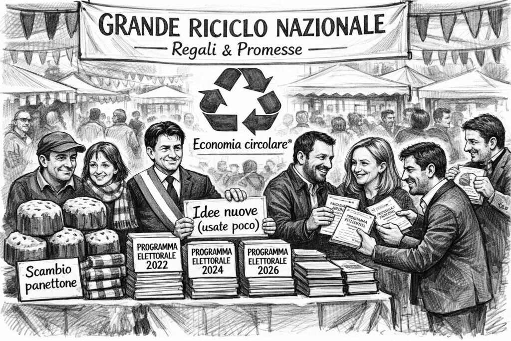 È come se gli italiani che riciclano i regali decidessero di regalare panettoni che non hanno mai ricevuto, promettendo di comprarli “prima o poi”. Il sistema crollerebbe immediatamente. In politica, invece, il meccanismo si perpetua: le promesse circolano, vengono riconfezionate, riproposte ad ogni elezione, mentre i cittadini – come destinatari di regali sempre uguali – finiscono per non crederci più.