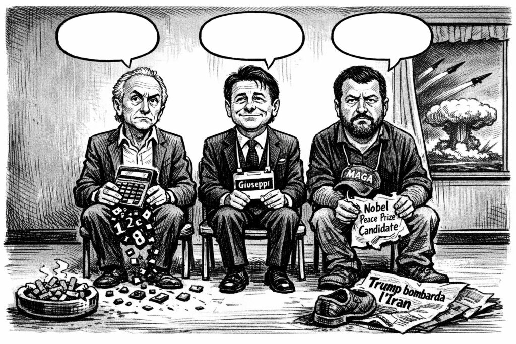 Quello che lega questi personaggi è l’imbarazzo. Hanno tutti, chi più chi meno, costruito una narrazione su Trump come uomo di pace. Chi lo ha teorizzato (Travaglio), chi lo ha frequentato (Conte), chi lo ha osannato (Salvini). Oggi si ritrovano con un presidente che bombarda l’Iran, che apre nuovi fronti, che rende la matematica di Travaglio una barzelletta, i rapporti di Conte un ricordo ingombrante, il Nobel di Salvini una macchia. E allora via col silenzio. Zitti, in un angolo, in attesa che passi la paura. Conte attacca il governo ma non il suo vecchio amico. Travaglio spiega che “ci sta svegliando” ma evita di dire che si era sbagliato. Salvini non apre bocca, se non per dire che se viene è il benvenuto.