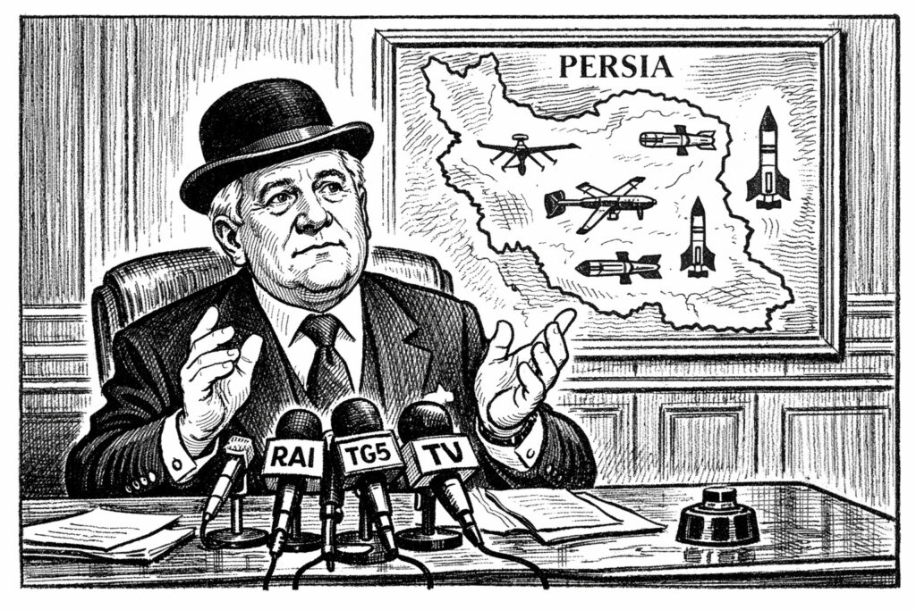 La mancanza di una qualsiasi modulazione emotiva nel linguaggio e nella postura del ministro trasforma ogni frase in un’involontaria parodia. Quando Tajani dice che i cittadini, in caso di attacco con droni, “devono stare nei garage”, lo dice come se stesse comunicando i pilastri della strategia militare italiana nel Mediterraneo. Quando, sempre davanti ai giornalisti compiacenti, telefona all’ambasciatrice Paola Amadei che sta fuggendo dall’Iran, le chiede con straordinaria tranquillità: “Oggi come sono stati i bombardamenti?”. Il tono è quello di chi sta facendo conversazione al bar sul tempo, ma il contenuto riguarda la morte e la distruzione. È il vuoto dello stile di Totò che detta: tutto suona formale e grave, ma fuori luogo.