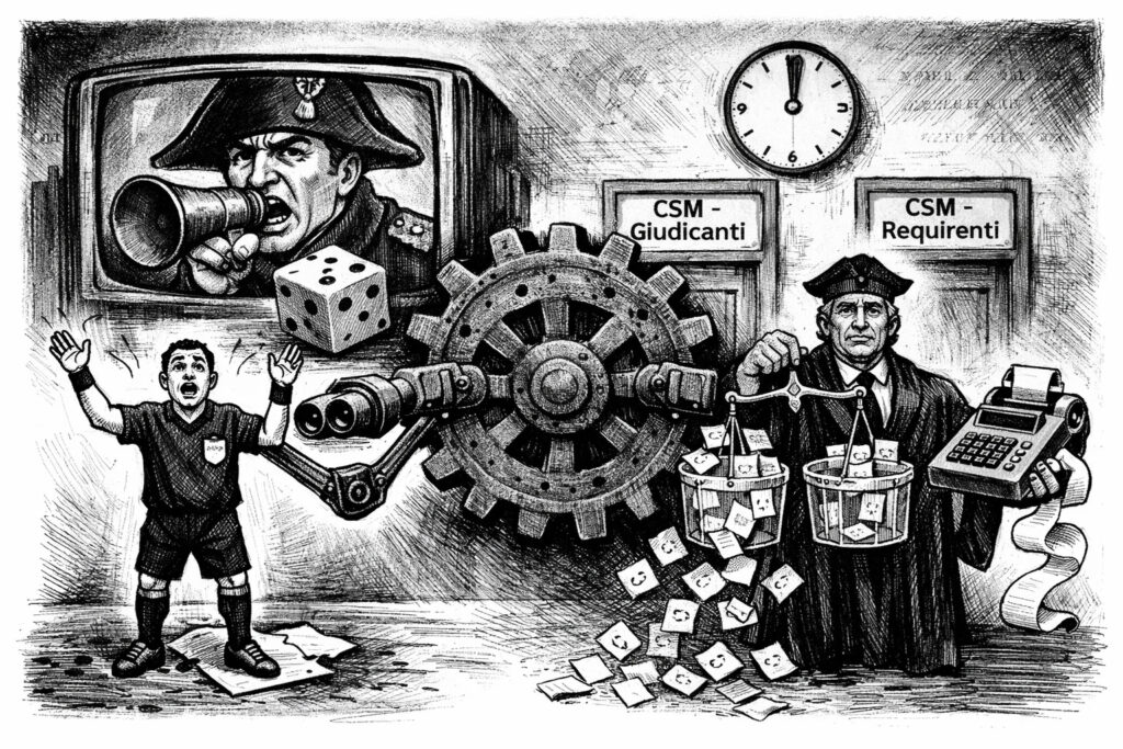 Il VAR, concepito come occhio discreto e imparziale, si è trasformato via via nel corso degli anni in un “Napoleone in campo”, un decisore remoto che frammenta il gioco e spesso opacizza, anziché chiarire, le decisioni. Allo stesso modo, la riforma giudiziaria, con la sua architettura di due CSM distinti e l’introduzione del sorteggio per la selezione di alcuni componenti, rischia di credere che la perfezione di un meccanismo – la lotteria – possa guarire i mali cronici di un sistema complesso.