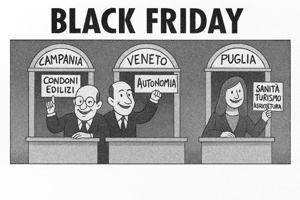 C’è un momento dell’anno in cui il consumatore medio si trasforma in predatore di offerte, pronto a lanciarsi tra scaffali virtuali e centri commerciali per accaparrarsi l’ultimo smartphone o la friggitrice ad aria scontata. Quel momento si chiama Black Friday. Ma quest’anno, in Italia, la coincidenza con la discussione della finanziaria e con le imminenti elezioni in Campania, Veneto e Puglia ha generato un curioso cortocircuito: la politica sembra aver adottato la stessa logica dei saldi, proponendo emendamenti last minute come fossero coupon da distribuire agli elettori. E dire che vanto di questa maggioranza era dire di avere la manovra economica bloccata, non più alla merce del cosiddetto assalto alla diligenza. E invece…