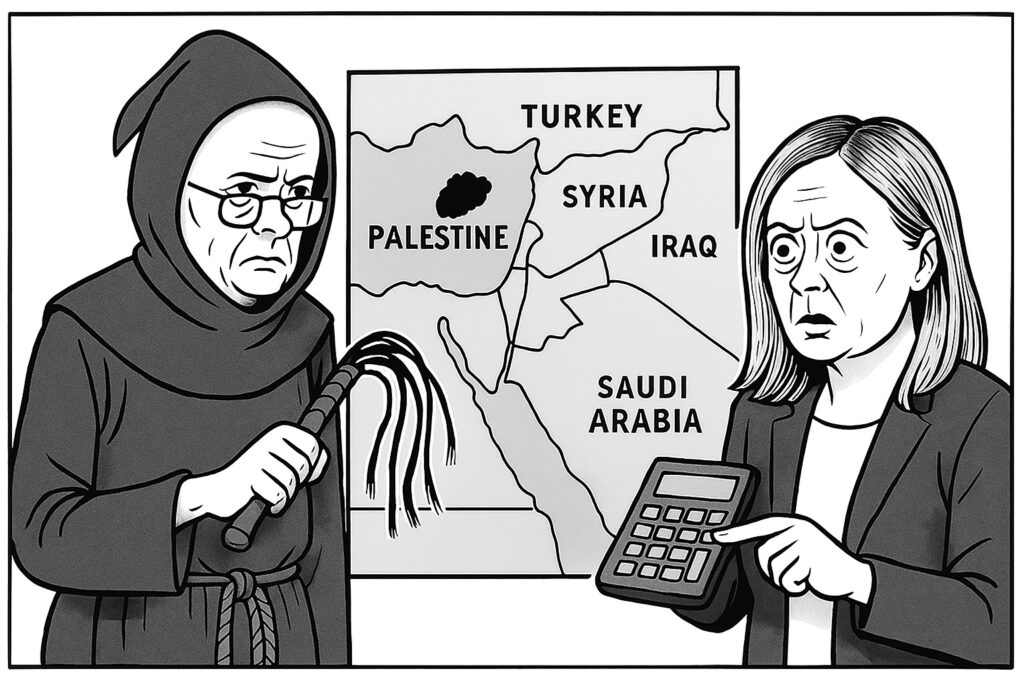 Mentre la Sumud Flottiglia si avvicina sempre di più al limite estremo del suo viaggio e i rappresentanti istituzionali del nostro paese limano le loro dichiarazioni per non rischiare figuracce in caso di derive ingovernabili della vicenda, resta la questione del riconoscimento del virtuale stato di Palestina a dominare lo scenario internazionale. E anche lì il nostro paese, a differenza dell’altra nazione europea che all’ONU ha rifiutato di accodarsi alla proposta Macron, c’è arrivato tra un distinguo, un balbettamento e un “parliamo d’altro”.