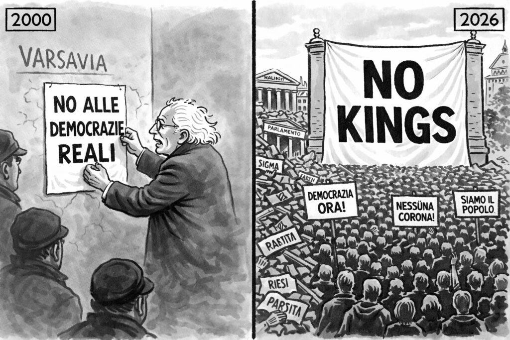 Il peccato storico non è che Pannella si sia sbagliato. È che sia morto nel momento preciso in cui la sua voce sarebbe stata necessaria e che nessuno abbia raccolto il testimone quando serviva ancora. La Comunità della e delle democrazie rimane un’idea negli archivi radicali. La Community of Democracies continua le sue riunioni formali mentre il sistema si disintegra. La società civile transnazionale, quando finalmente si mobilita massicciamente con “No Kings”, arriva a combattere una battaglia difensiva contro un potere che si è già consolidato, contro un’autocrazia che si è già trasformata in democrazia reale, quella che Pannella aveva identificato come il vero nemico.