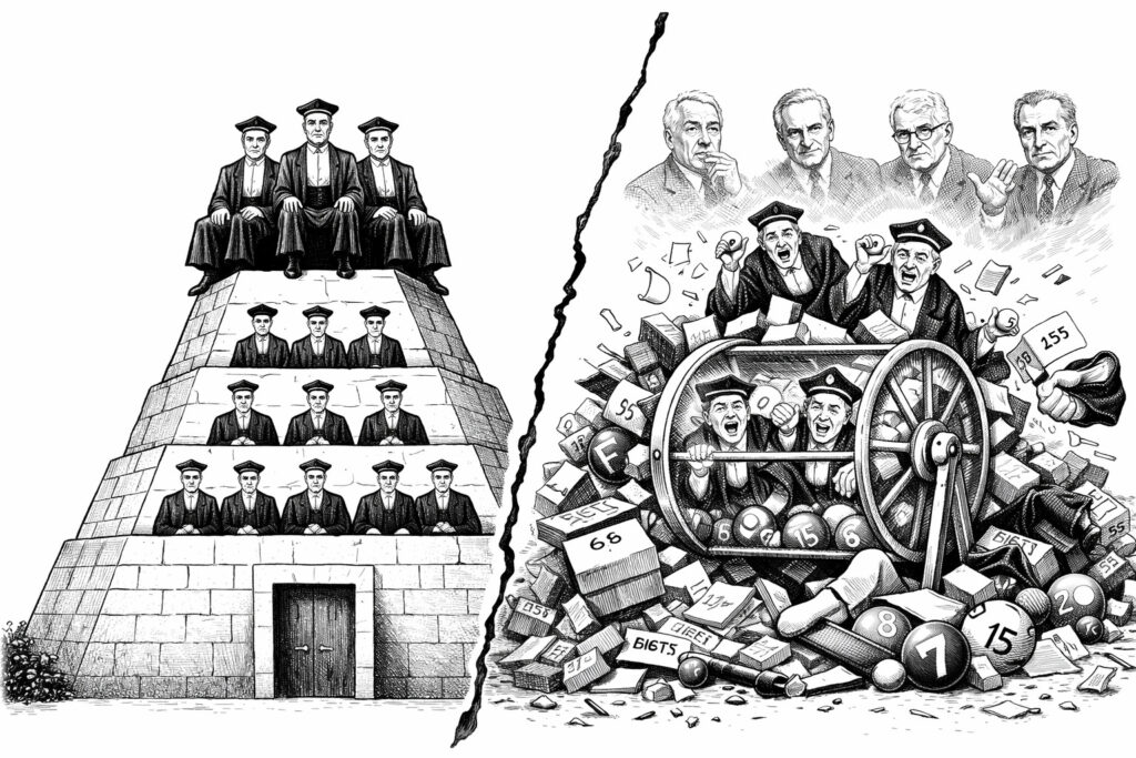 Per capire l’inganno odierno, bisogna raccontare la storia vera del CSM. Quando nasce nel 1958 non è quello che immaginate. È una struttura piramidale, rigida, controllata dai magistrati di cassazione — l’élite invisibile. Non ci sono liste, non ci sono correnti ufficiali. C’è solo la gerarchia. I magistrati di cassazione decidono tutto: nominano, trasferiscono, proteggono i loro. È un ordine feudale con la toga. La politica non può farci nulla perché il CSM è autonomo. È uno stato dentro lo stato. Per scendere nei particolari, il sistema elettorale del CSM era maggioritario e strutturato per categorie (Cassazione, Appello, Tribunale), con un meccanismo di designazione che favoriva i magistrati di Cassazione nel controllo dell’organo. Questo prometteva loro un dominio grazie al voto differenziato e ai limiti che privilegiano i loro rappresentanti designati. Le elezioni prevedevano designazioni iniziali: l’ufficio centrale nazionale formava liste di designati per categoria (Cassazione, Appello, Tribunale). Ogni magistrato votava con limiti: max 6 per Cassazione (almeno 4 designati), max 4 per Appello (almeno 3 designati), max 4 per Tribunale (almeno 3 designati). I magistrati di Cassazione, essendo il gruppo apicale e più numeroso tra gli elettori qualificati per quel voto, dominavano la designazione e l’elezione dei loro 6-8 seggi, assicurandosi una maggioranza relativa nel CSM (totale togati: 14).