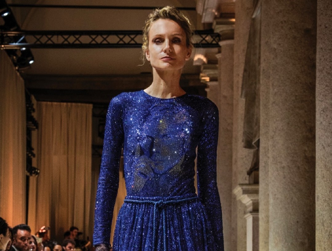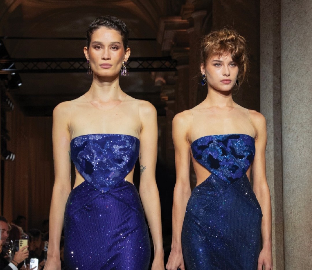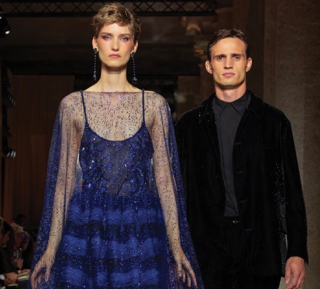 Una passerella tra sogno e capolavori pittorici immortali come quelli di Raffaello e Tiepolo, 127 look (82 da donna e 45 da uomo), che raccontano l’ultima visione di Giorgio Armani: abiti leggeri come pensieri, tuniche che accarezzano l’aria, completi da uomo in sete impalpabili, blazer destrutturati e dhoti reinventati. La sua isola, Pantelleria, ha prestato la palette: sabbia bruciata, lava, pietra, blu oltremare. Per la sera, l’Oriente: viola, zaffiro, plissé in toni di luce. E sempre, ai piedi, scarpe basse: un segno di umiltà, forse. O di verità.