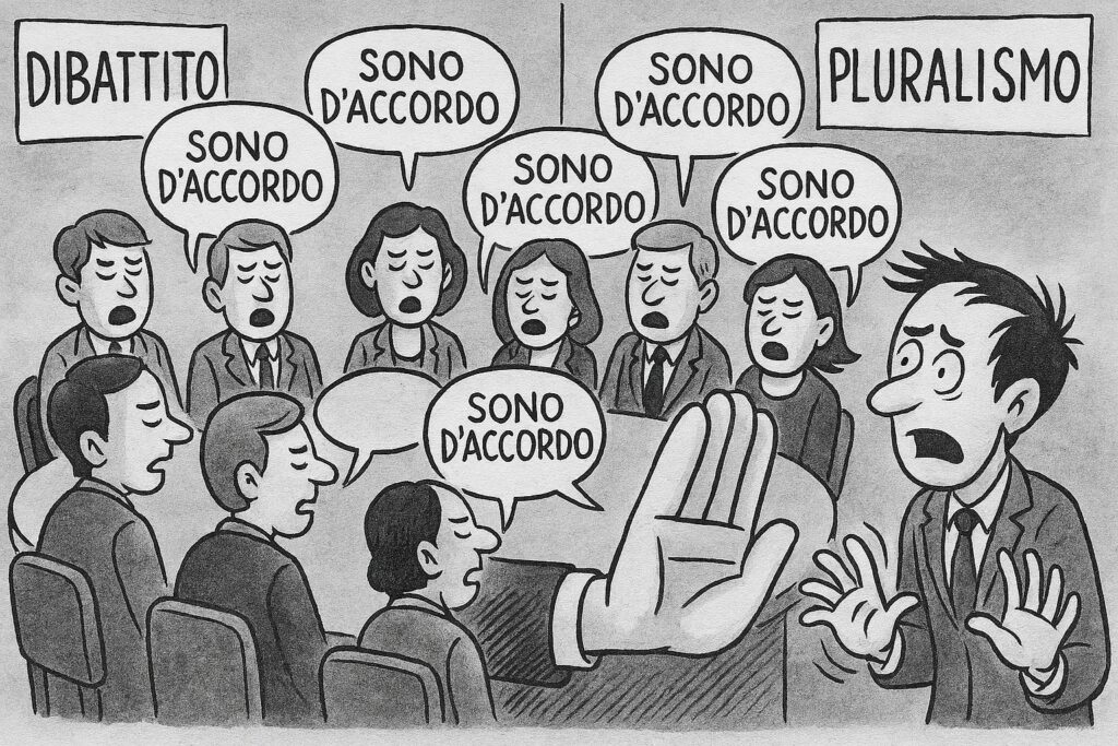 Università, istituzioni e società civile perdono la capacità di autocorrezione. Il dibattito si riduce a una performance preconfezionata, dove si confermano senza sosta le stesse tesi. Nei festival letterari, nelle università e nei media si ripete lo stesso copione di uniformità. Recuperare il vero dibattito significa considerare la diversità di opinioni come una risorsa, accettare che chi pensa diversamente non è necessariamente in malafede ma semplicemente vede il mondo da una diversa prospettiva. Significa avere il coraggio di organizzare confronti autentici, rinunciando alla comodità del coro unanime.