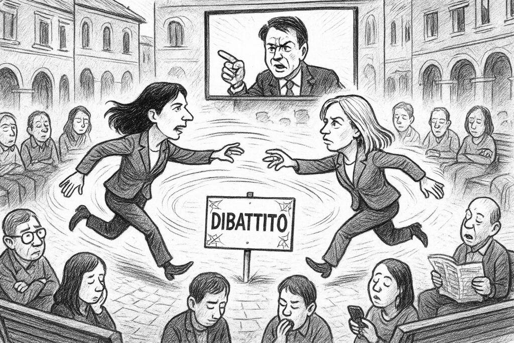 Ma ecco che Meloni accetta, rilanciando: va bene il confronto, ma deve esserci anche Giuseppe Conte. La mossa è brillante nella sua semplicità: trasforma il duello in un ring affollato, dove nessuno davvero si misura con nessuno. E soprattutto, spalanca la porta a una serie infinita di condizioni e controcondizioni.