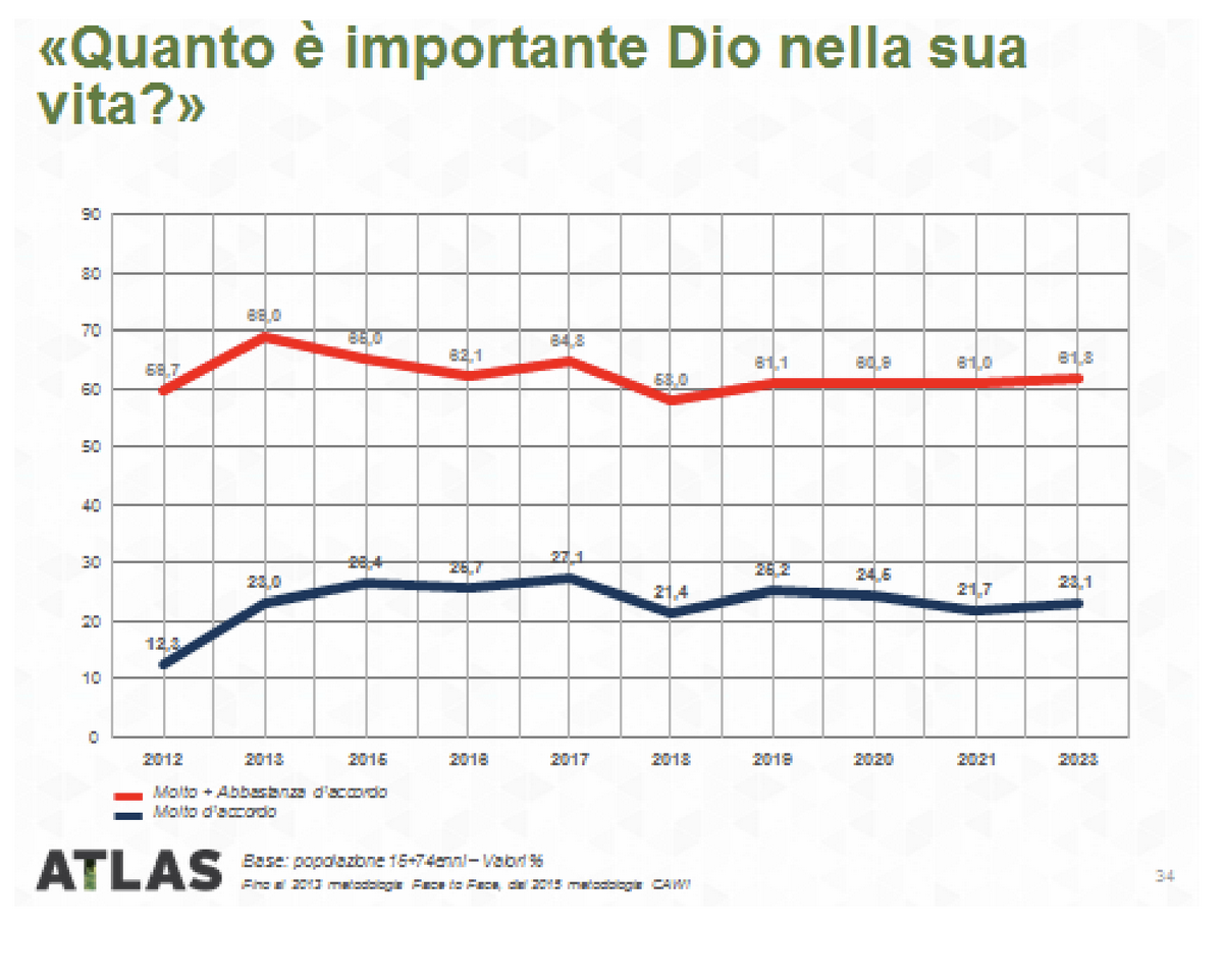 Abbandonando per un attimo il quadro globale, complesso e stratificato in cui si colloca la nomina di Leone XIV, osserviamo questo evento sullo sfondo del quadro socioculturale italiano e del rapporto degli italiani con la religione, così come viene fotografato da Atlas. Chissà che questa visione semplificata, in relazione agli atteggiamenti e alle opinioni espresse dalle persone, possa avere valore anche in un contesto più allargato, quale quello contemporaneo, attraversato da correnti motivazionali che vengono e vanno lontano. Un aspetto semplice, di una semplicità così capace di sfiorare il battito vitale dell’essere umano, è il bisogno di religiosità. E’ sorprendente constatare quanto poco il dibattito internazionale si sia occupato di questa, banalissima evidenza, acuita dal crescere dello spaesamento nell’uomo contemporaneo.