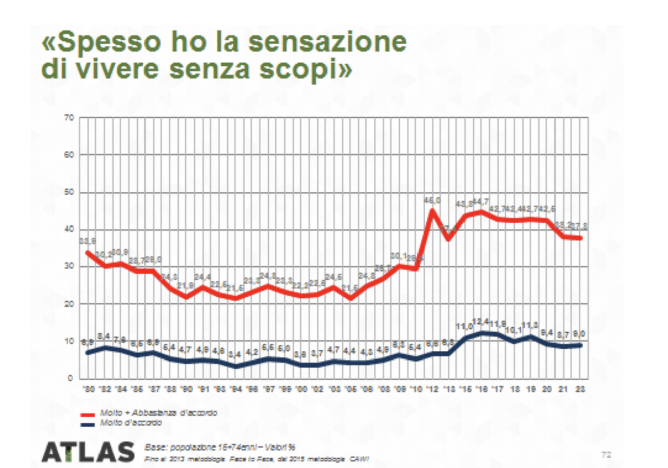 Come vediamo nel megatrend in evidenza, la percezione di assenza di scopi è uno dei tratti più salienti dell’evoluzione del vissuto del campione intervistato, rappresentativo della popolazione italiana. Unitamente alla condizione di incertezza, che contraddistingue da anni ormai la soggettività contemporanea, il nostro stesso definirci umani, questo spaesamento si coniuga con bisogni profondi che afferiscono alla sfera religiosa e ne sostengono le ragioni.