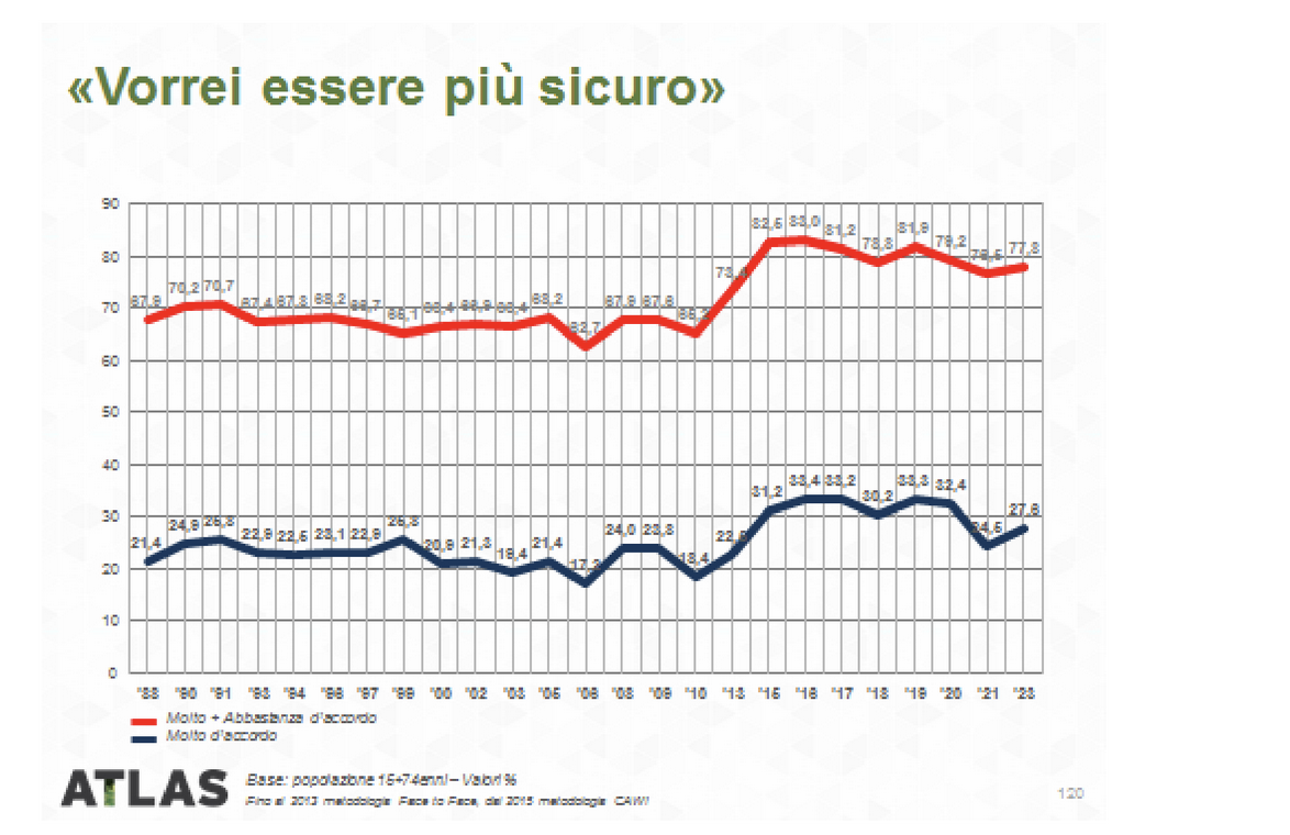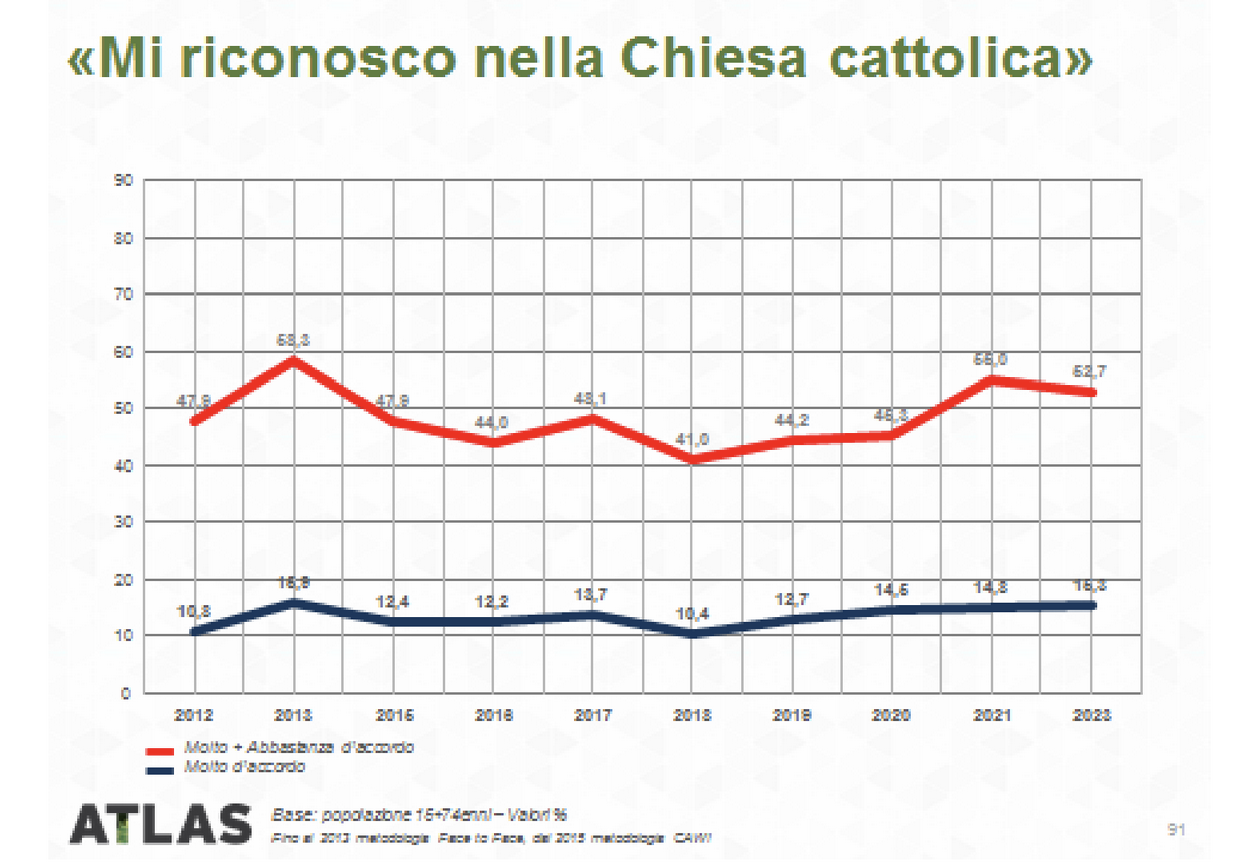 Papa Leone XIV si iscrive dunque in un rinnovato e arricchito interesse per la religione, alimentato anche dalla corrente dei laici, sempre più disposti a riconoscersi nella fede come in qualcosa da cui non si può prescindere. Come parte integrante del nostro stesso bisogno di sentirci protetti nel mondo. È altrettanto evidente, ed evidenziato nel trend qui riportato, quanto la religiosità registri un andamento inversamente proporzionale alla fiducia nell’organizzazione ecclesiastica.