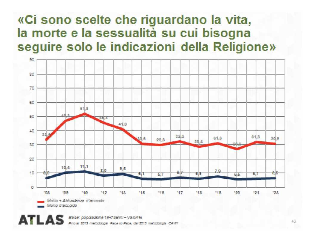 Non solo in reazione agli scandali e alle dinamiche di potere insite in ogni struttura organizzata, ma soprattutto per la distanza dei contenuti dottrinali con l’evoluzione della società. Ascesa delle donne e accettazione dell’omosessualità sono solo due esempi di questo scarto che induce le persone a respingere un’interferenza della chiesa nelle proprie scelte esistenziali, come risulta dai datI qui riportati.