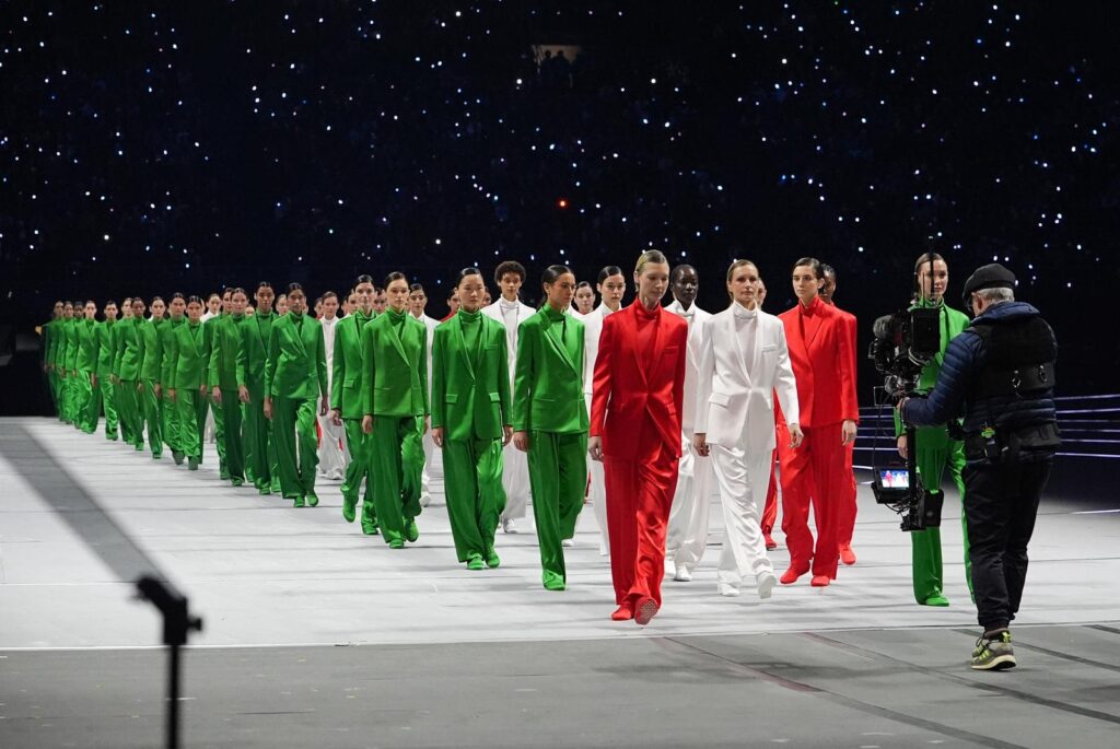 Sessanta tailleur pantalone, declinati nei colori della bandiera italiana, hanno attraversato la scena inaugurale delle Olimpiadi invernali di Milano Cortina 2026 come un manifesto visivo di eleganza e identità. Il rosso, il bianco e il verde si sono trasformati in pura espressione sartoriale, grazie a linee essenziali e a una costruzione impeccabile, cifra distintiva di uno stilista che ha fatto della sottrazione un’arte.